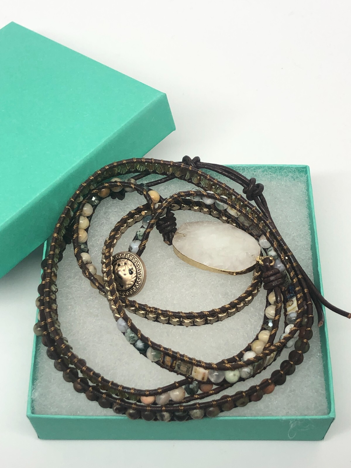 как выглядит Wrap bracelet Mixed Stone glass beads brown leather oval stone Boho 38" Unsigned фото