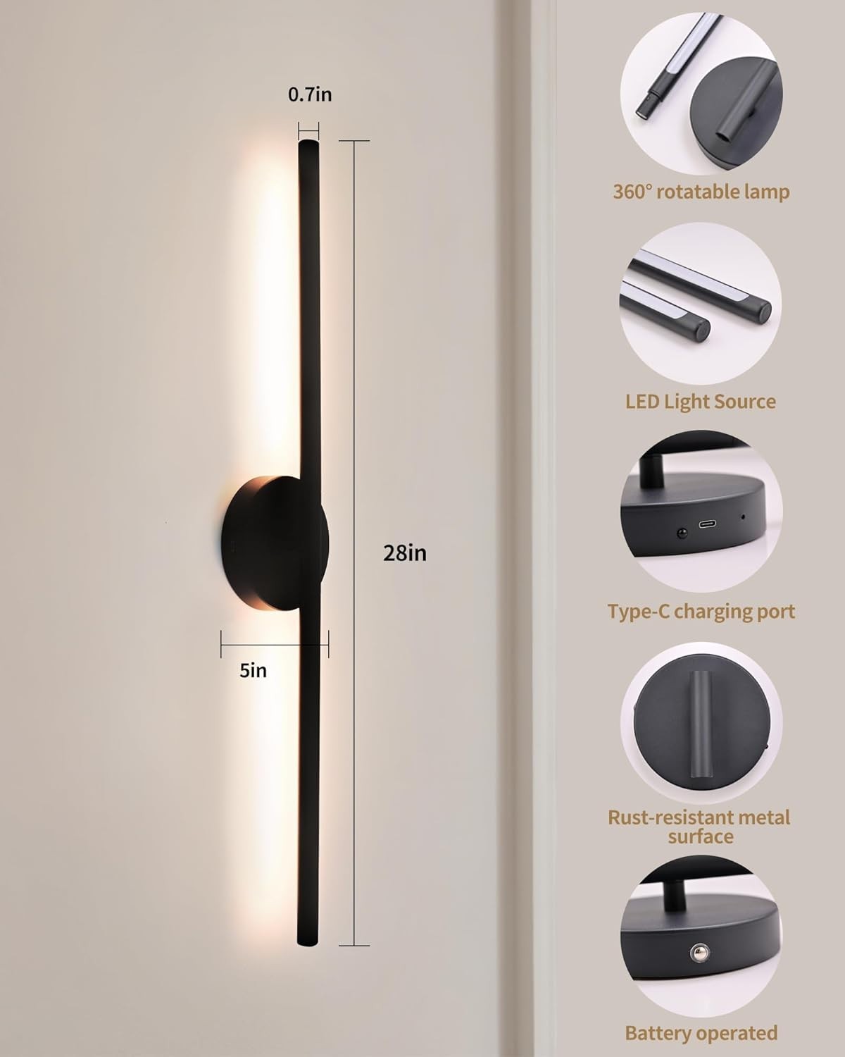 Wireless LED Wall Sconces Set of 2 Battery Operated, Remote, Dimmable, Black