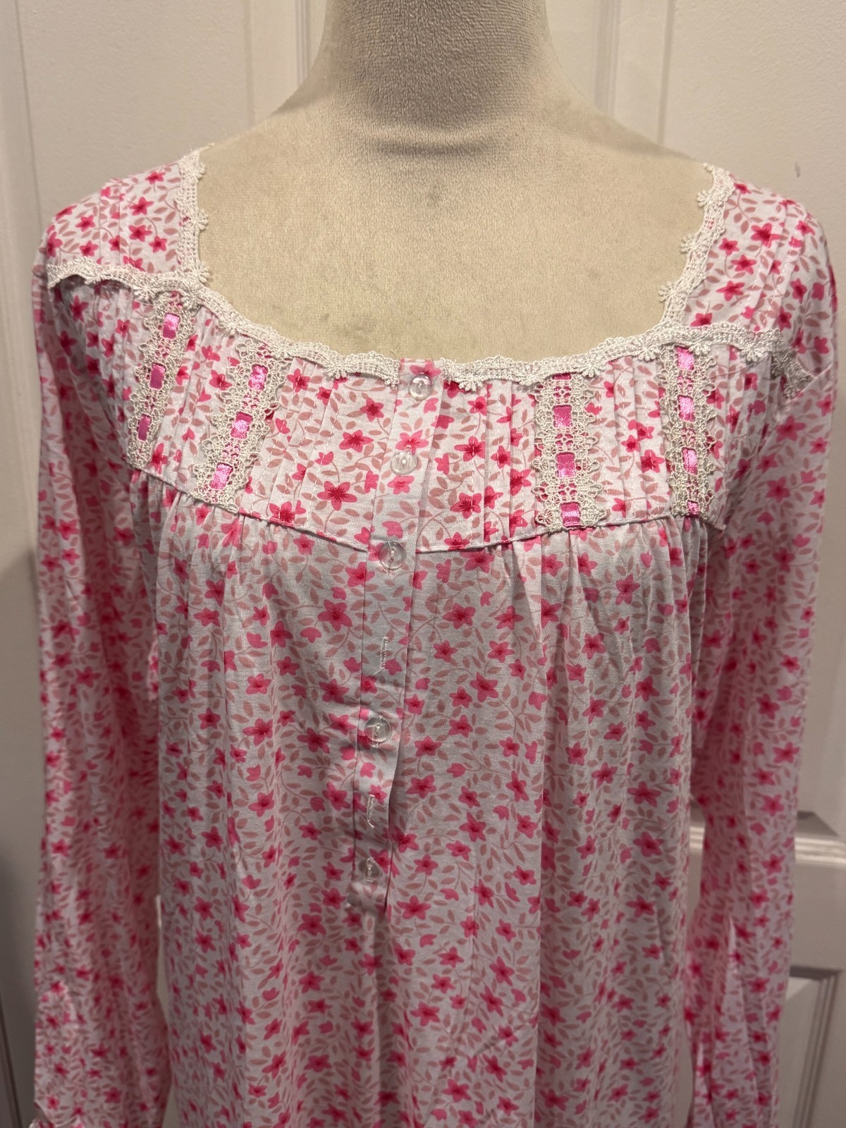 как выглядит Women Long Sleeve White w Hot Pink Flowers Nightgown button front 4XL 42"L x28"W фото