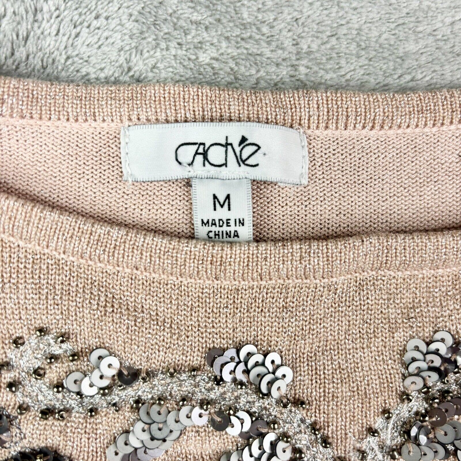 как выглядит Cache Silver Thread Beaded BUTTERFLY Size M Sweater Blush Pink Vintage 1990S фото