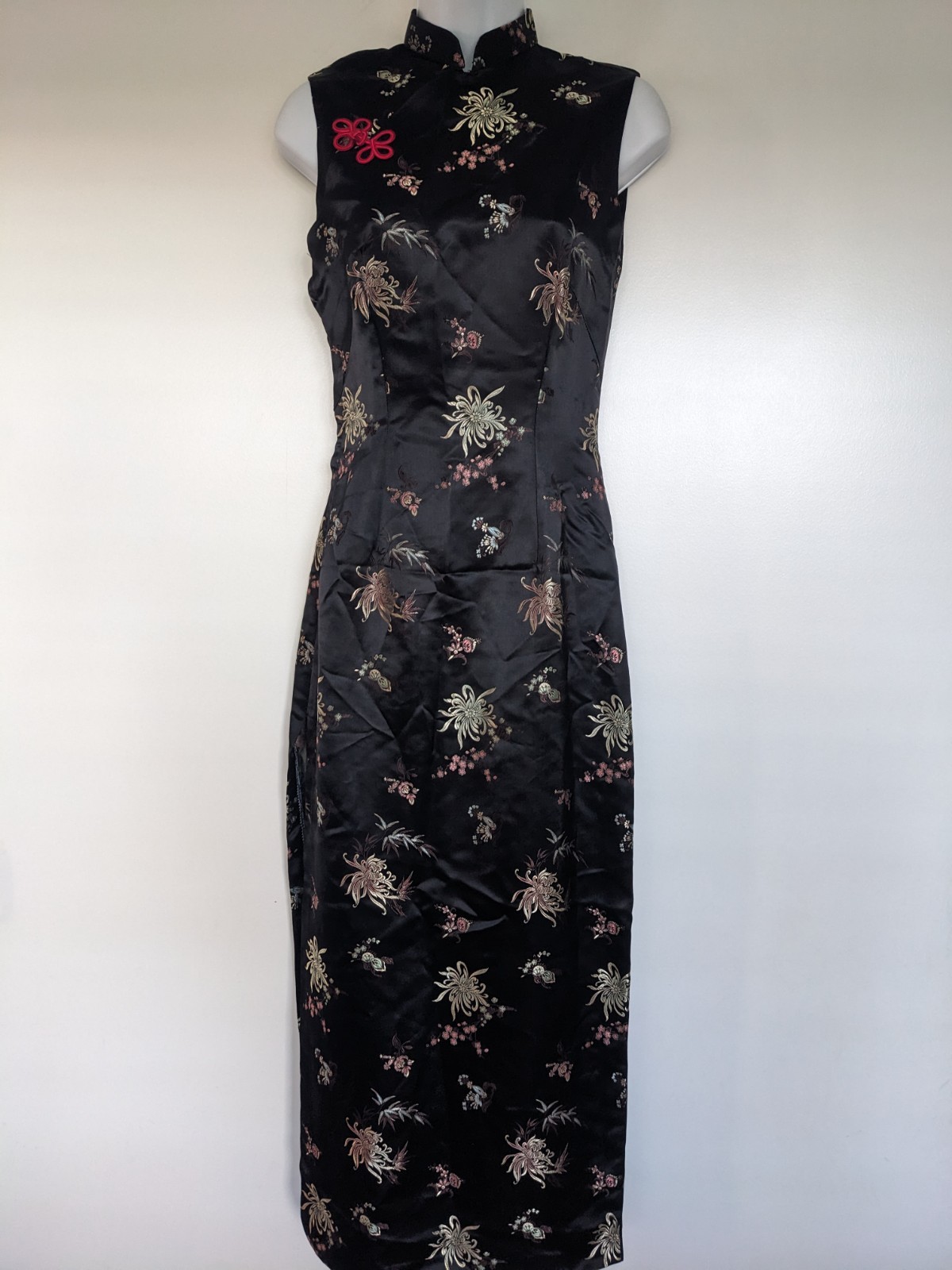 Vintage Cheongsam Dress Black Satin Asian Chinese Brocade Qipao sleeveless