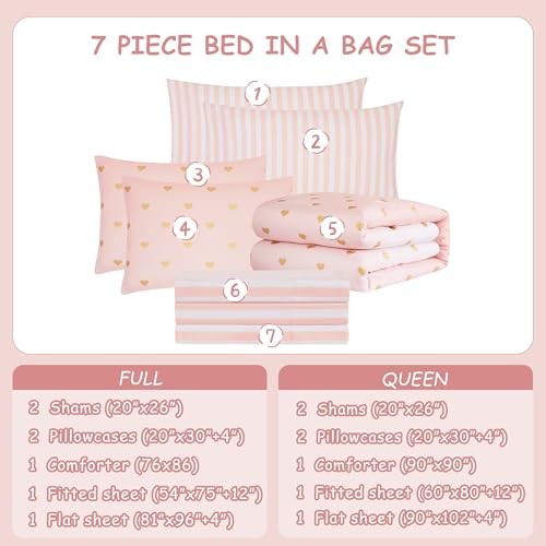 Full Size Comforter Sets with Sheets Full 76X 86 -7 Pieces Pink/Gold Heart