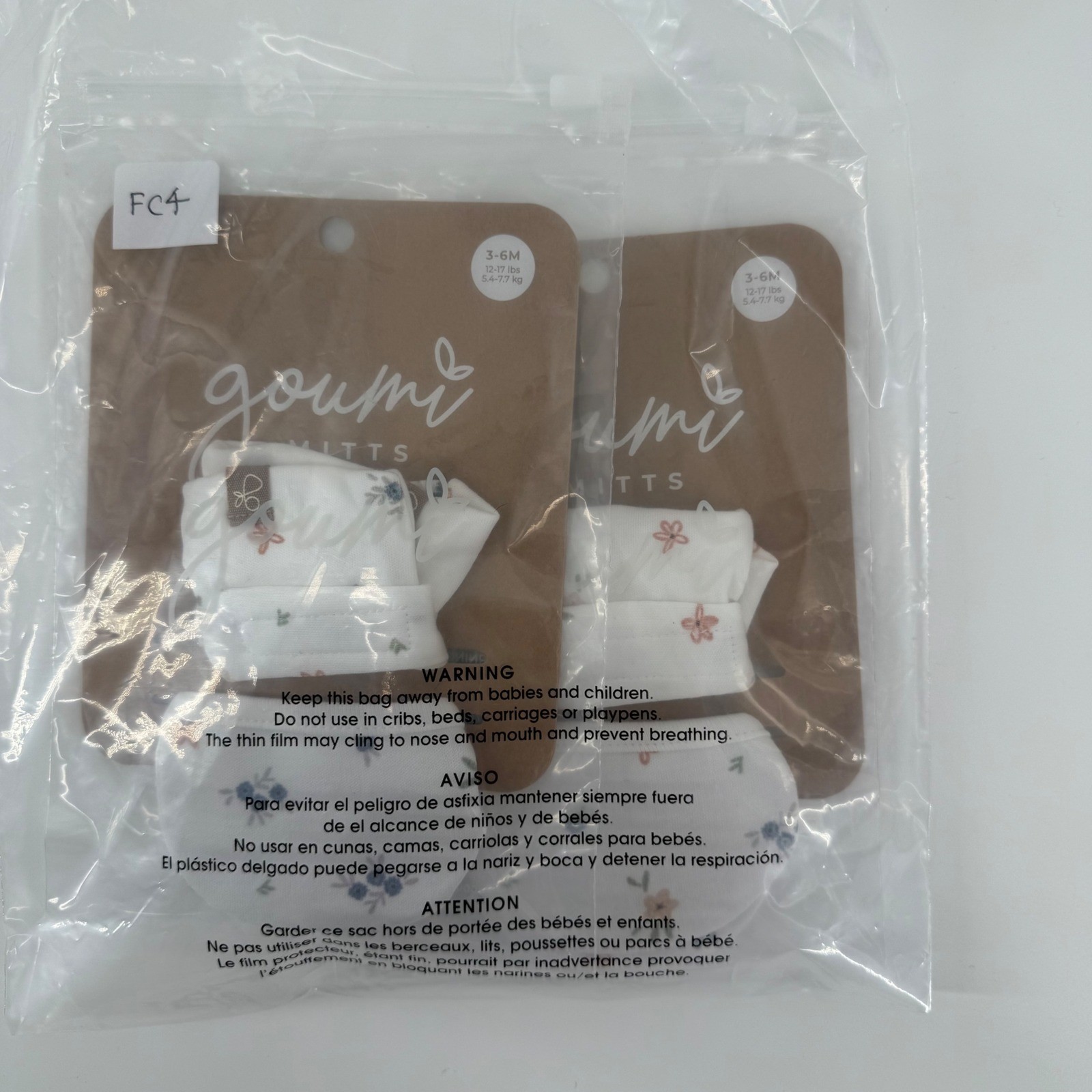 Goumi Mitts Baby Mittens 3-6M White Floral Scratch Prevention Machine Washable