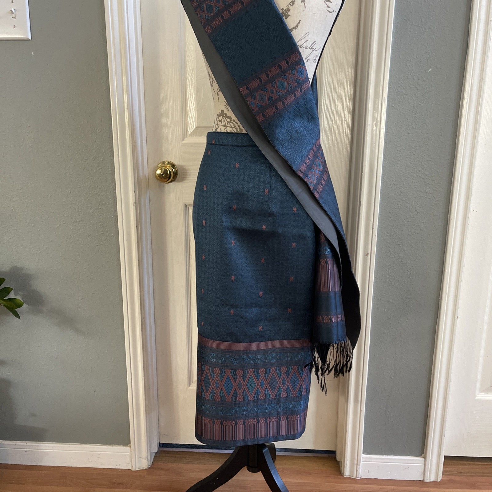 как выглядит Traditional Lao, Thai Khmer Skirt And Sash Adjustable Waist In Blue And Pink фото