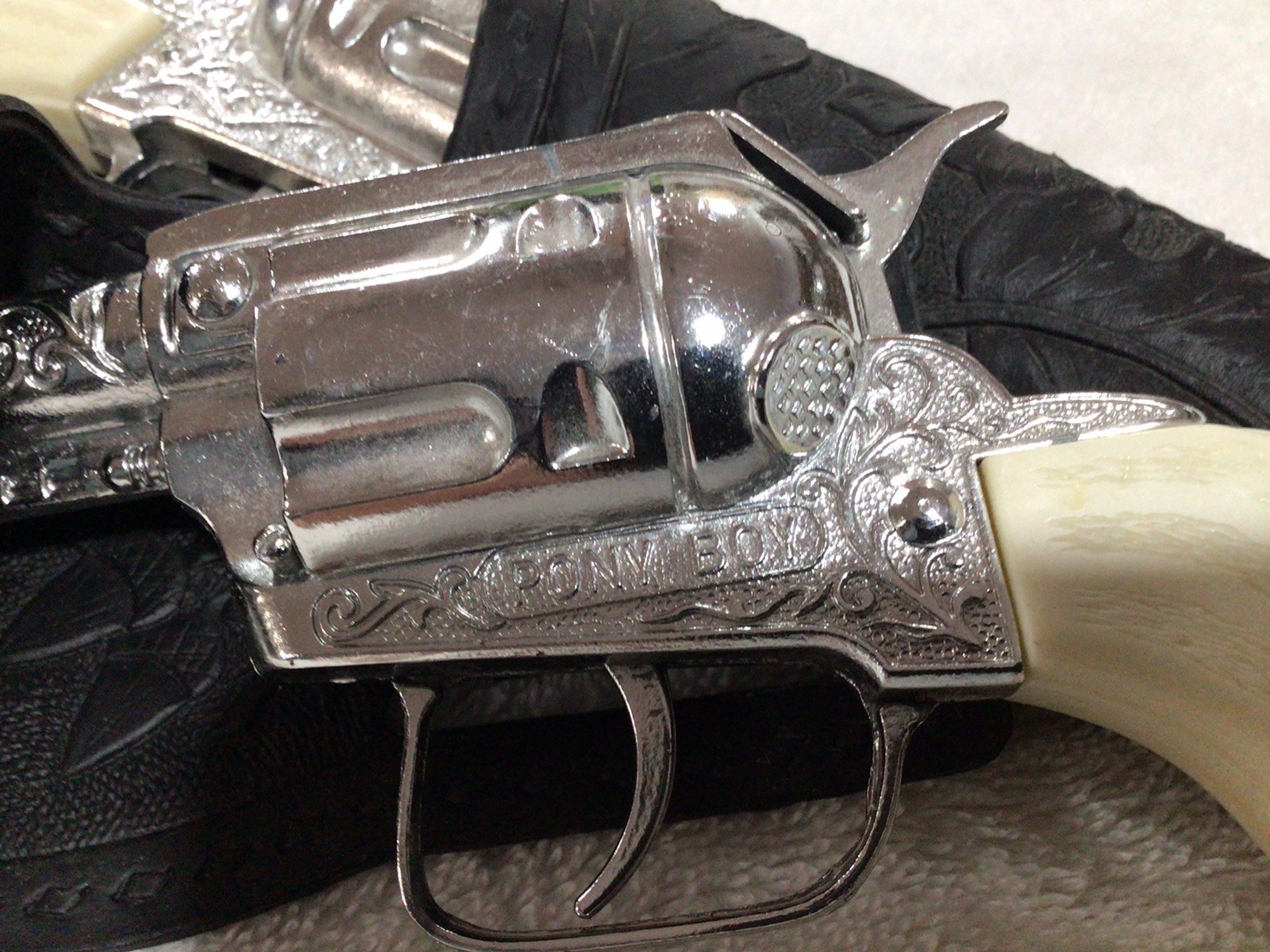 как выглядит Pair Of Pony Boy Toy Replica Diecast Cap Pistols Black Leather Holsters Working фото