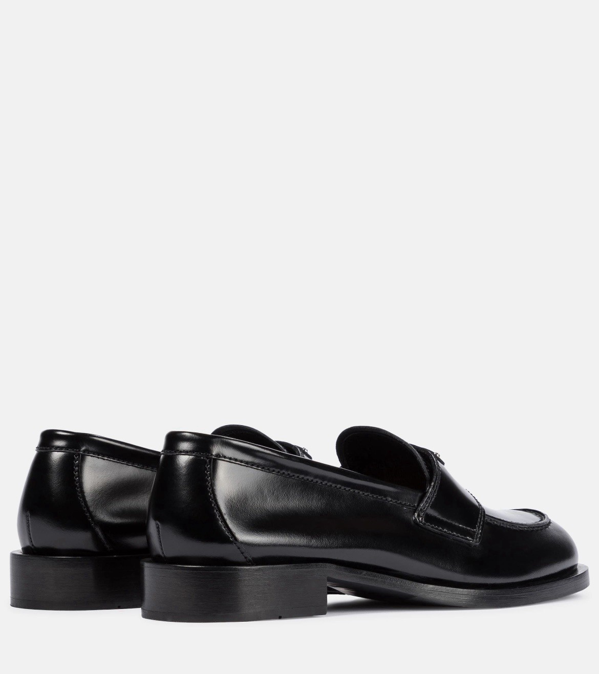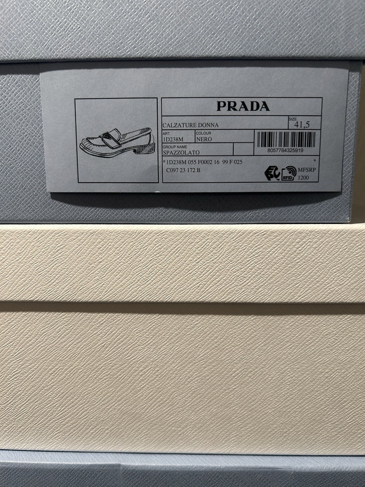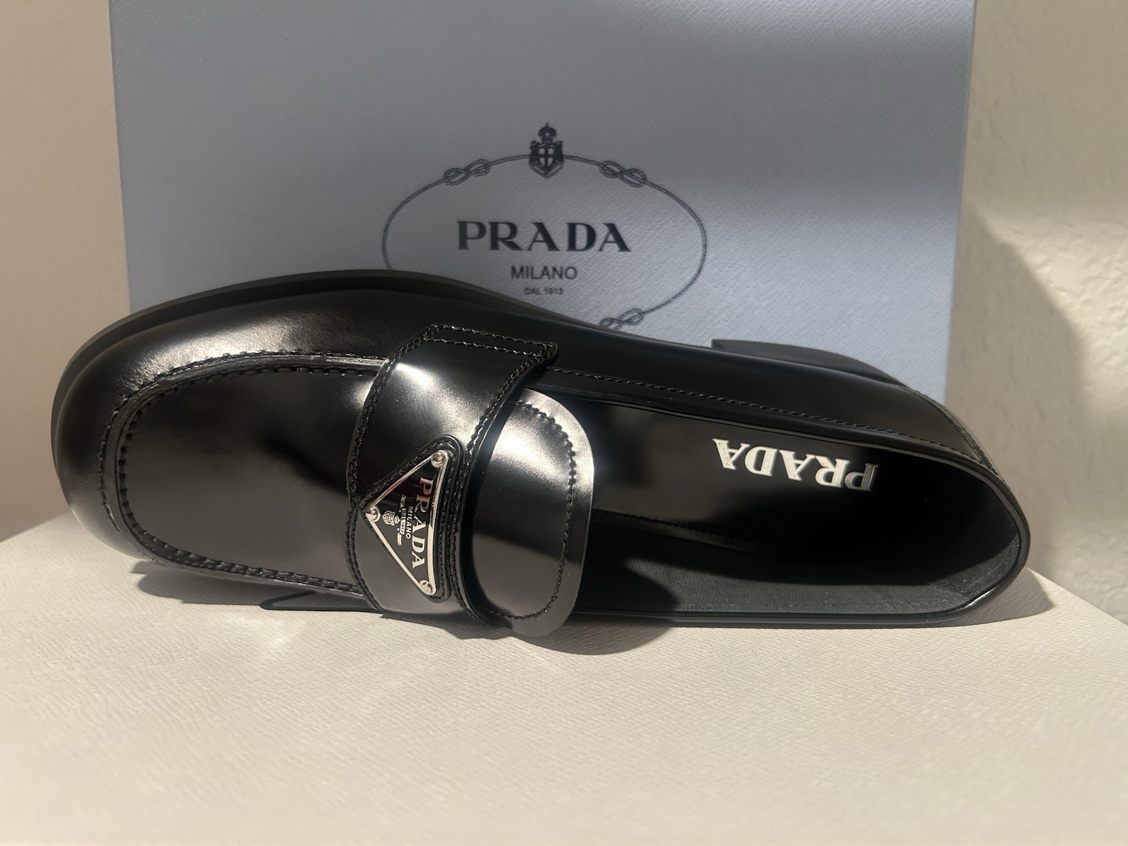 как выглядит 1170 NIB, PRADA BRUSHED BLACK LEATHER SHINY LOGO LOAFERS SZ 41.5 10 10.5 фото