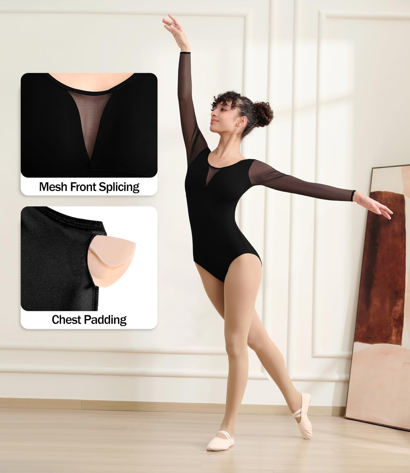 Women Dance Leotard Long Sleeve Leotard for Adult Ballet, V-shape Mesh Back, ...