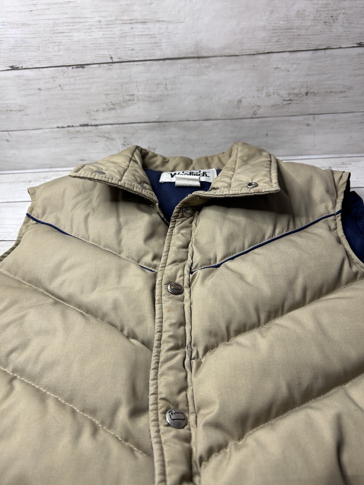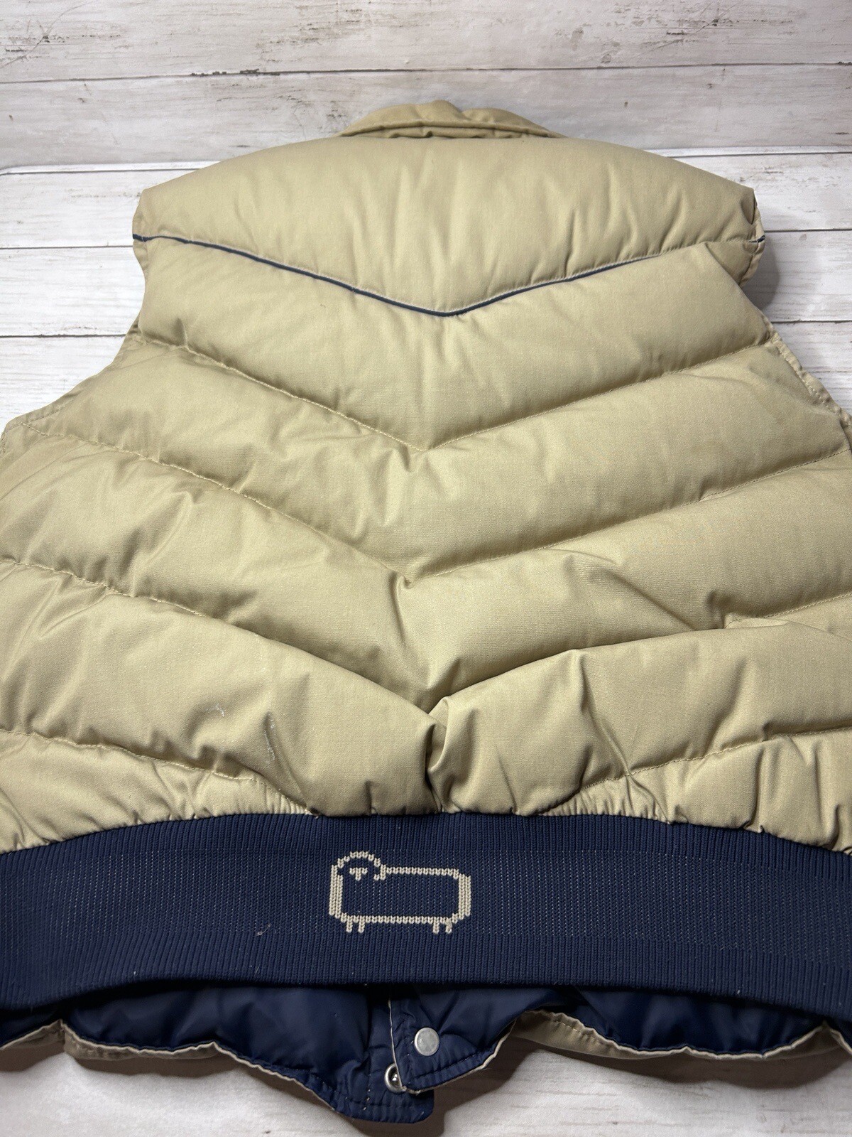 как выглядит Vintage Woolrich Puffer Vest Tan and Navy Blue Med/Lg фото