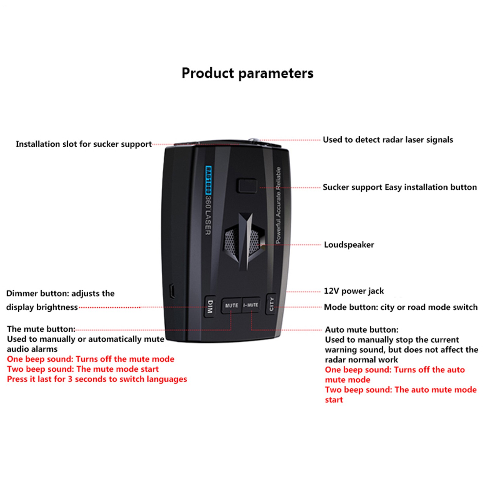 RAD1000 Car Speed Radar Detector English 5 Warning Modes Car Antiradar Alarm