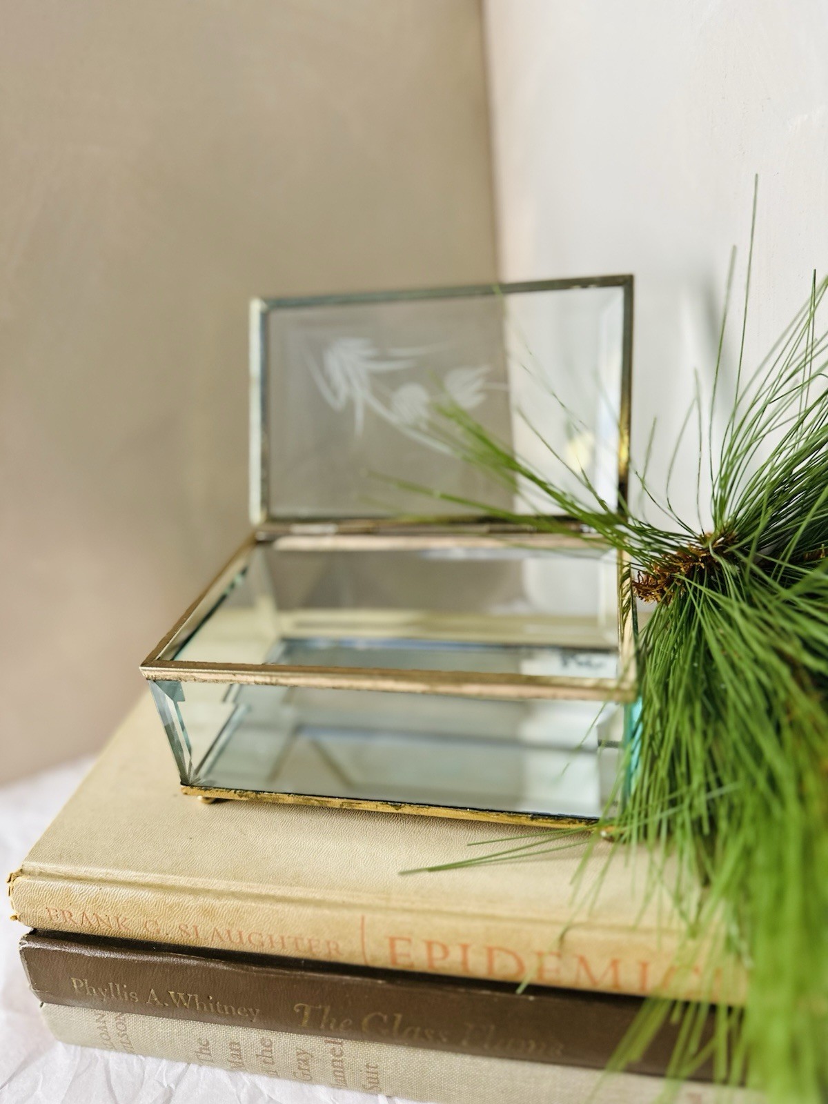 Vtg Etched Glass Brass Lidded Trinket Box Mirrored Bottom 5.25"