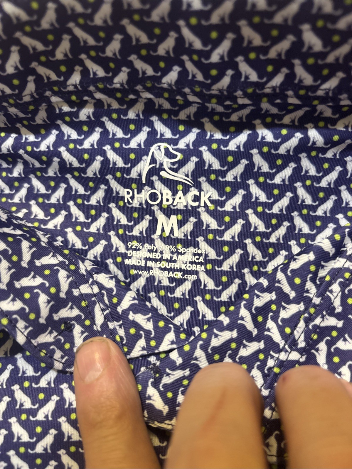 RHOBACK Polo Shirt Mens M Blue Dog Pup Tennis Ball Golf Performance Sport