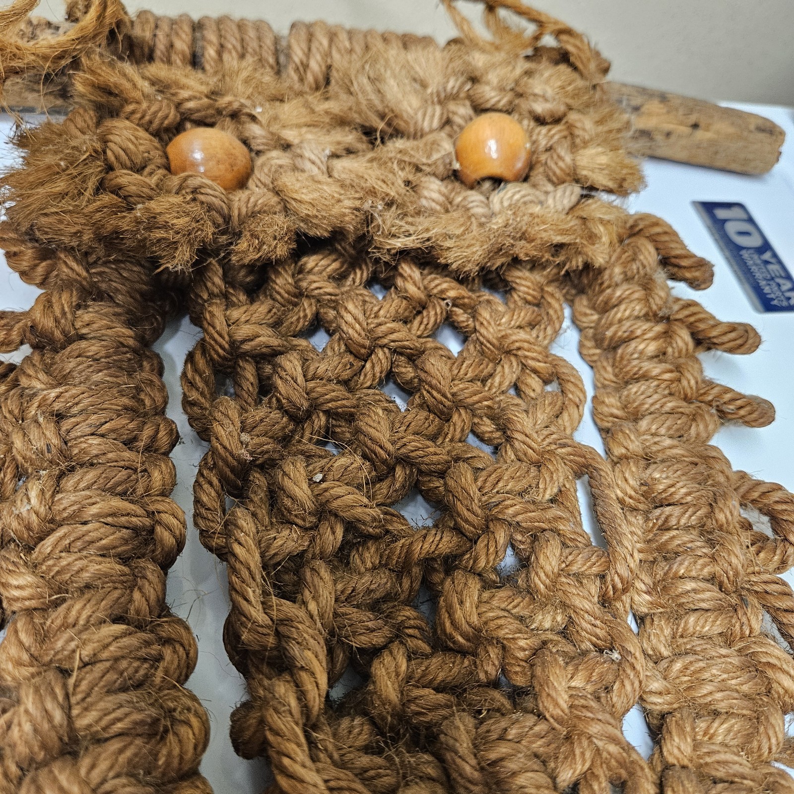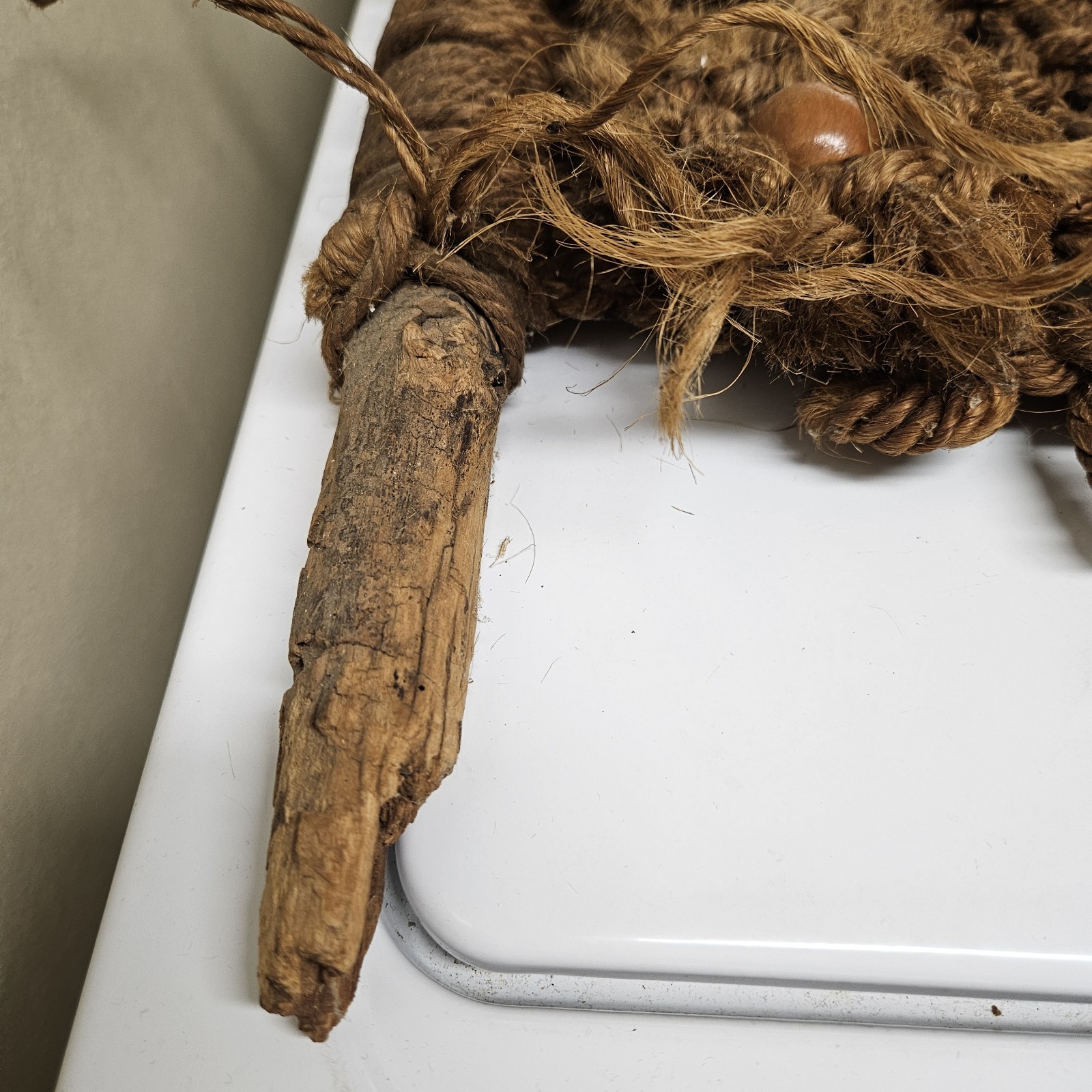 Vintage 70s Macrame Owl Drift Wood Wall Hanging Folk Art Decor Handmade Boho MCM