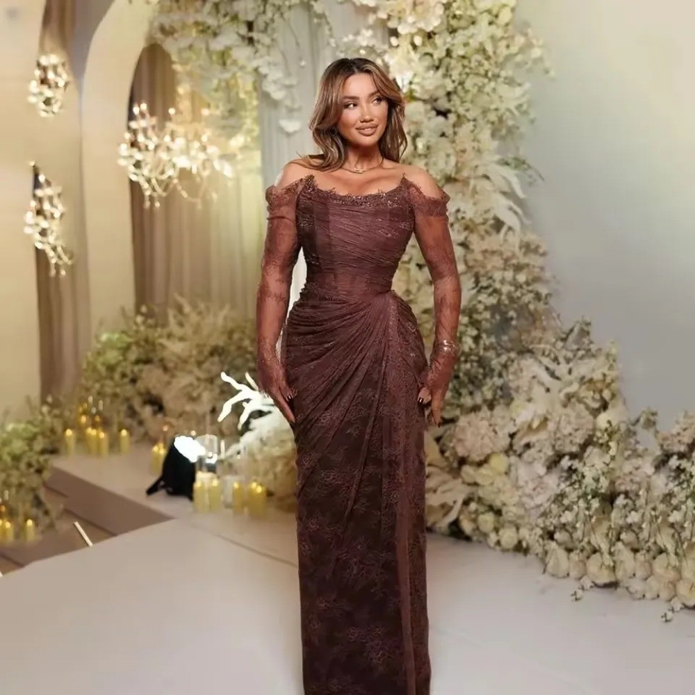Chocolate Lace Sheath Mother Of Bride Dress Long Sleeves Off Shoulder Party Gown