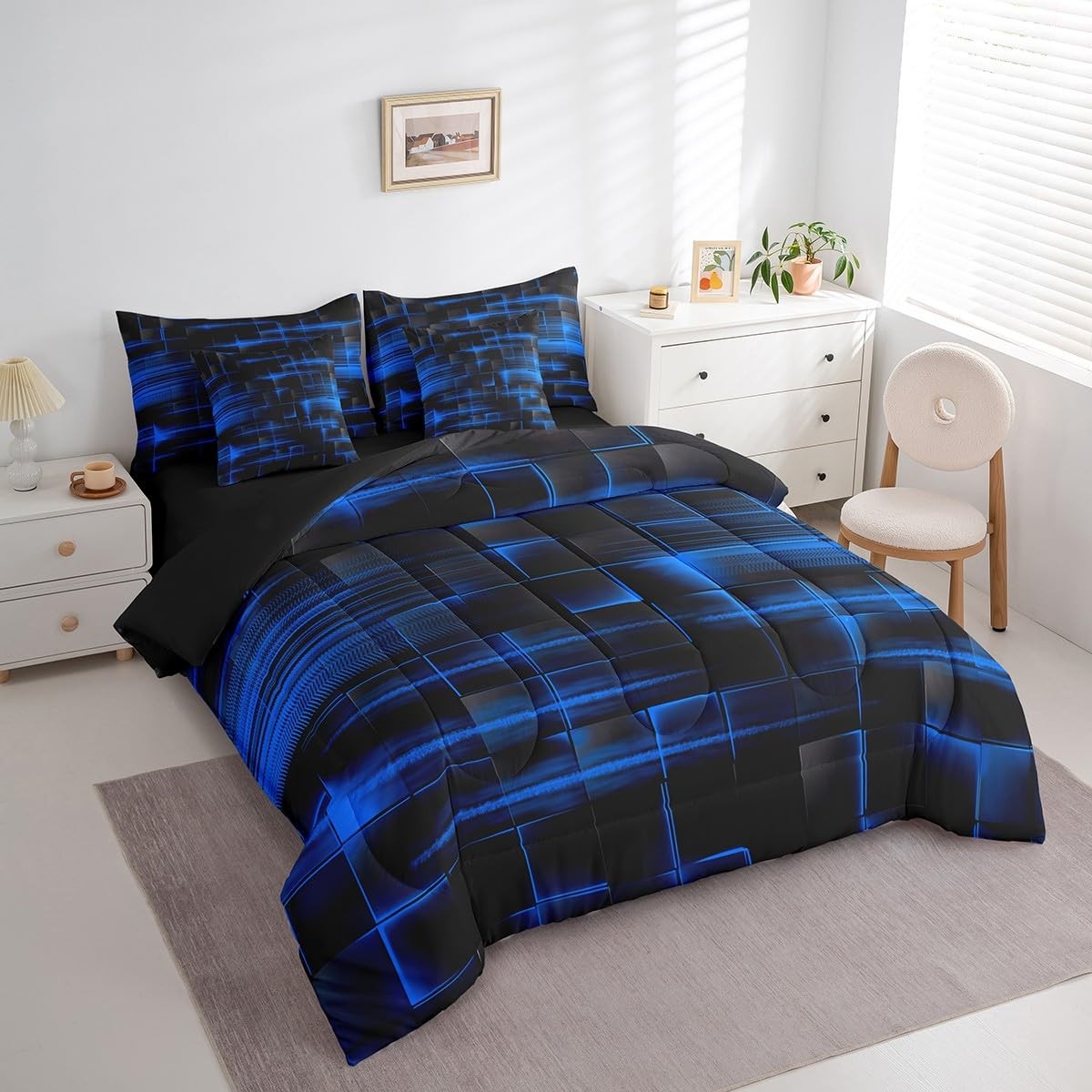 Blue Black Bedding Set Full Size Boys Girls Geometric Strip Lines Comforter S...