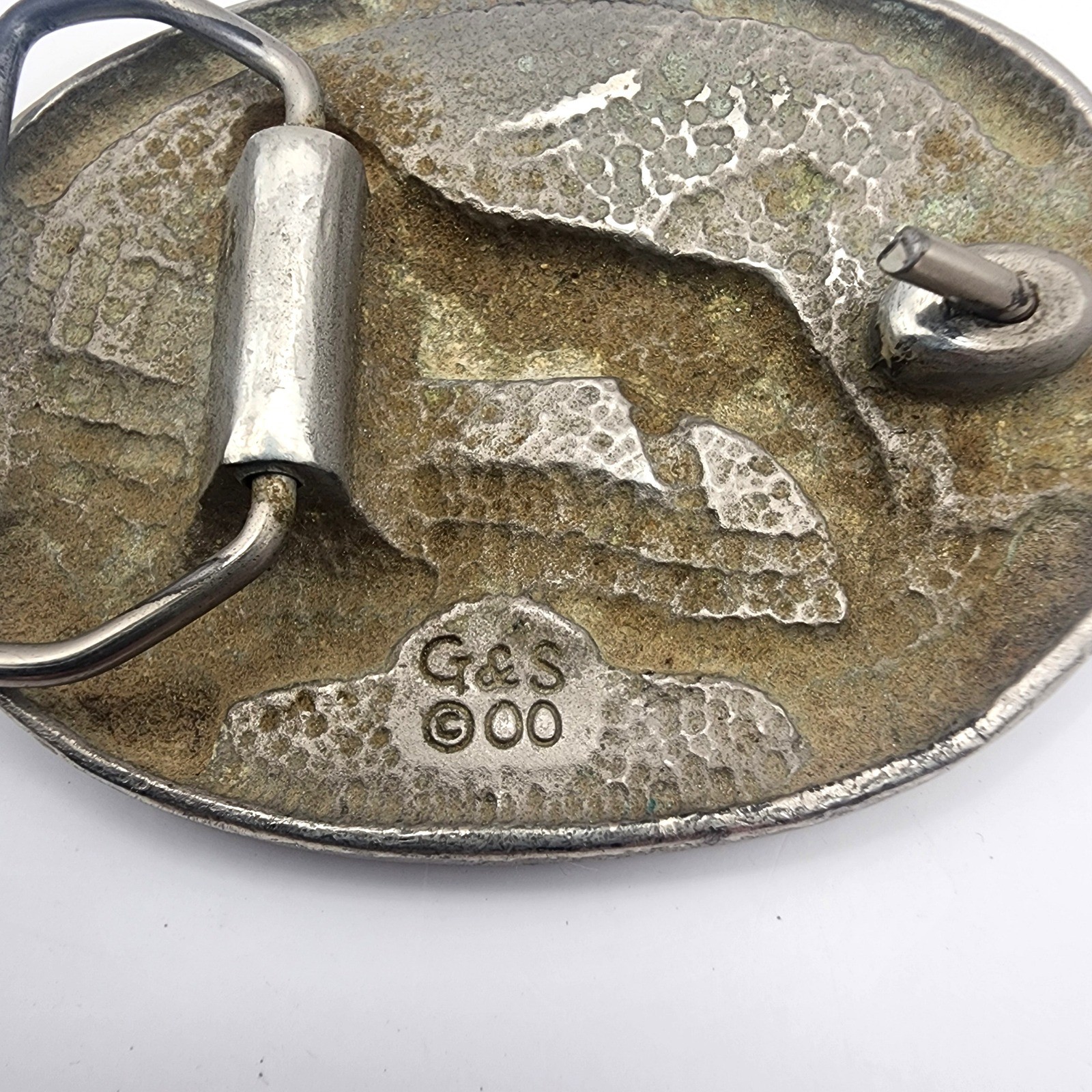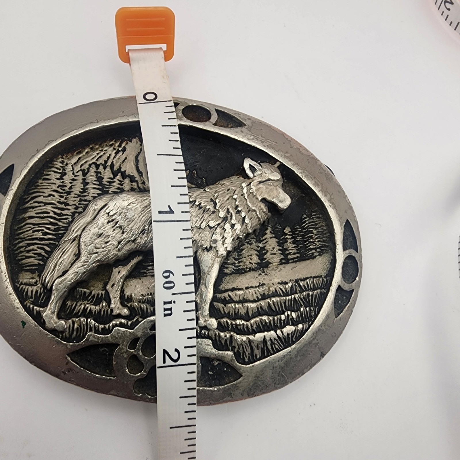 как выглядит Vintage G S Oval Wolf Mountain Scene Pewter Belt Buckle фото