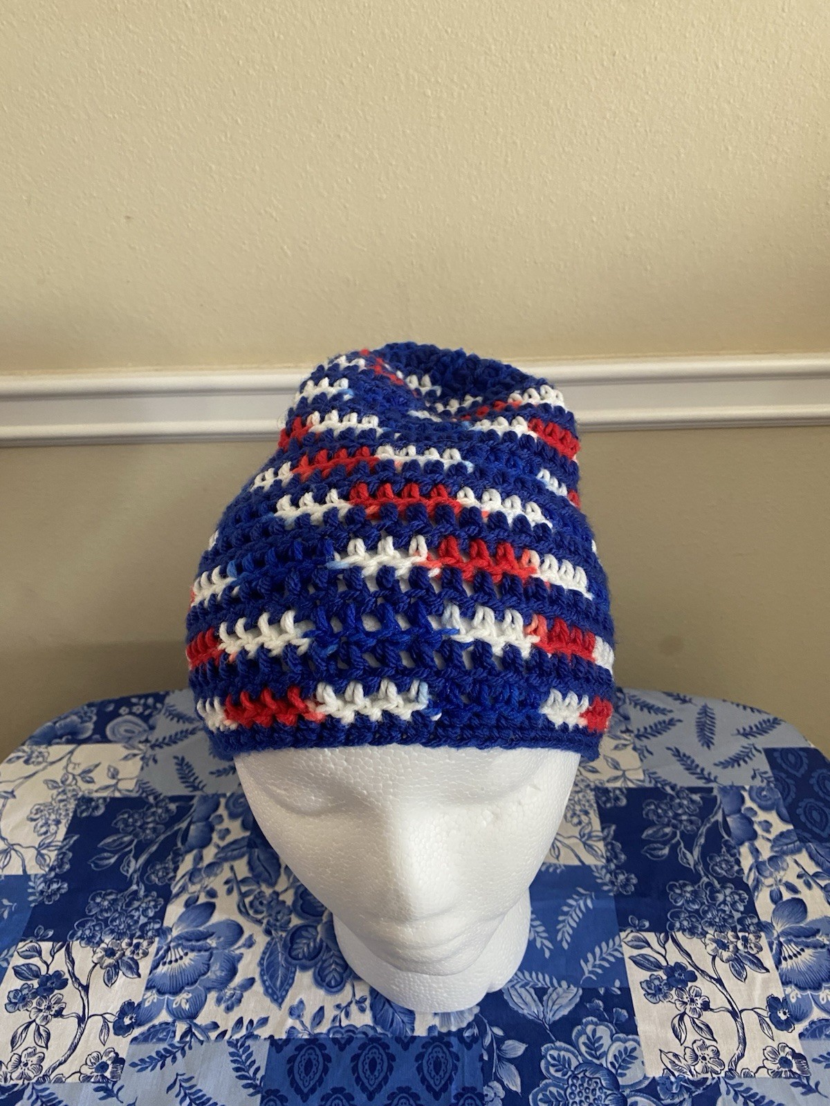 как выглядит Blue, Red, White Slouch Crochet Beanie - Handmade фото