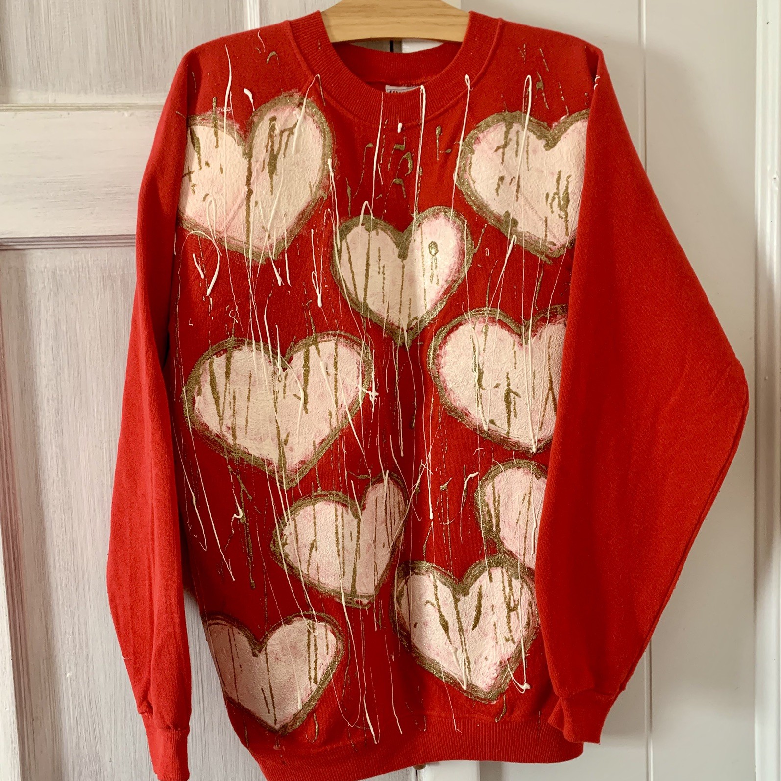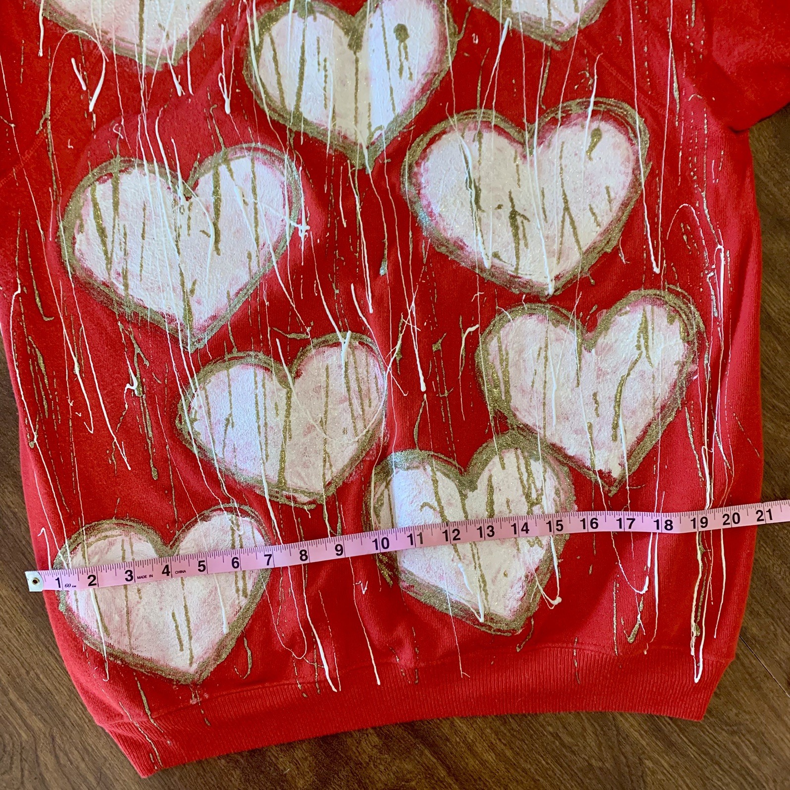 как выглядит Vintage Valentines Day Red Sweatshirt with painted hearts gold paint spatter L фото
