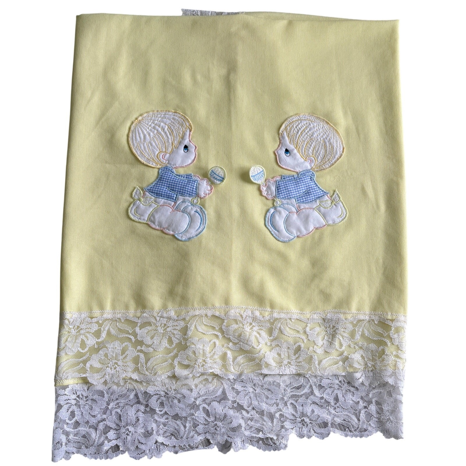 Vintage 80 s Precious Moments Baby Blanket Butter Yellow Lace Patch Siblings