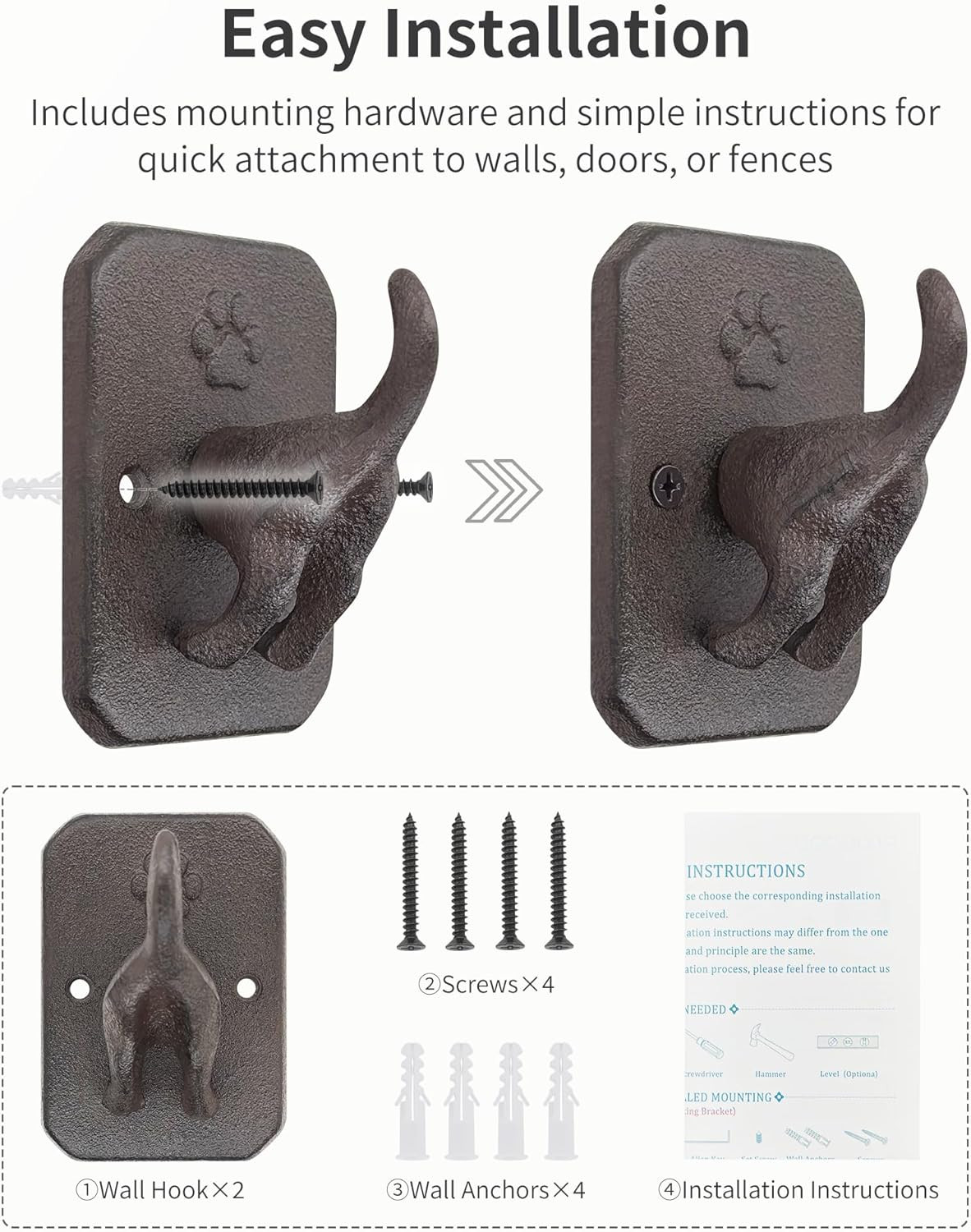 Included Components: 1 Installation Instructions, 2 Wall Hooks, 4 Screws, 4 Wall Ancho