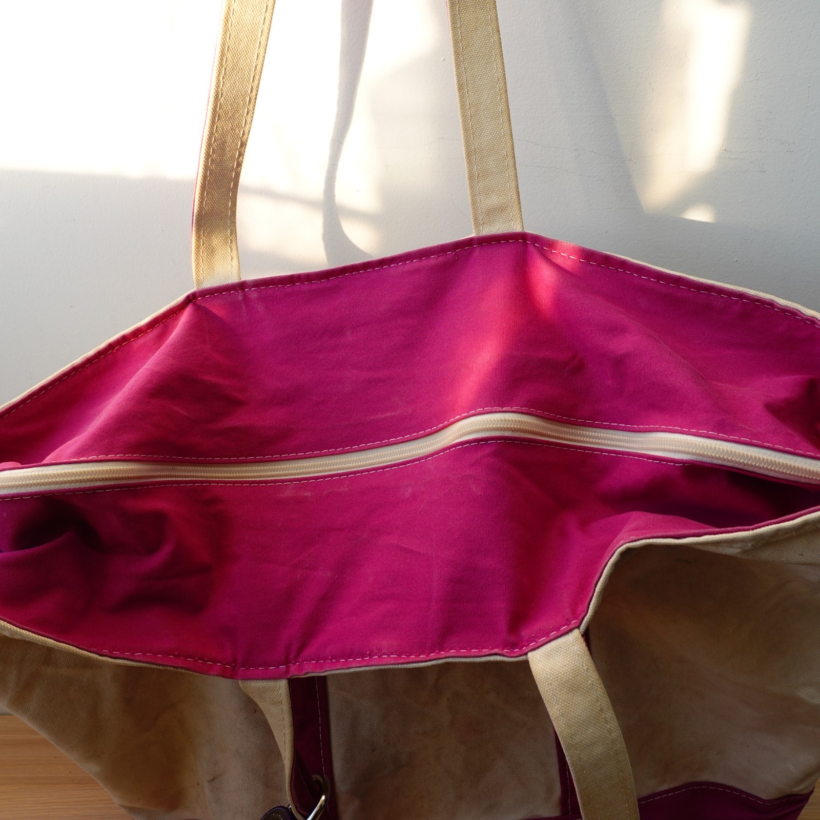 Vintage LL Bean Boat and Tote Bag XL Pink Cream Canvas Zip Top Weekender USA