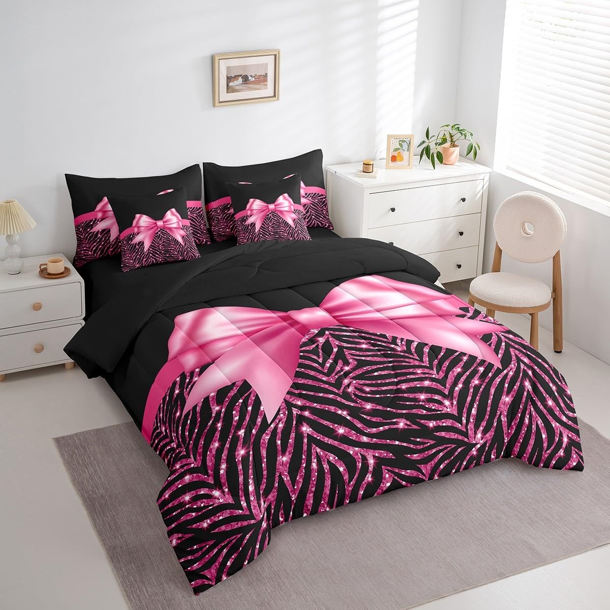 Pink Bowknot 7 Piece Bedding Set Queen Size Glitter Print Comforter Set with ...