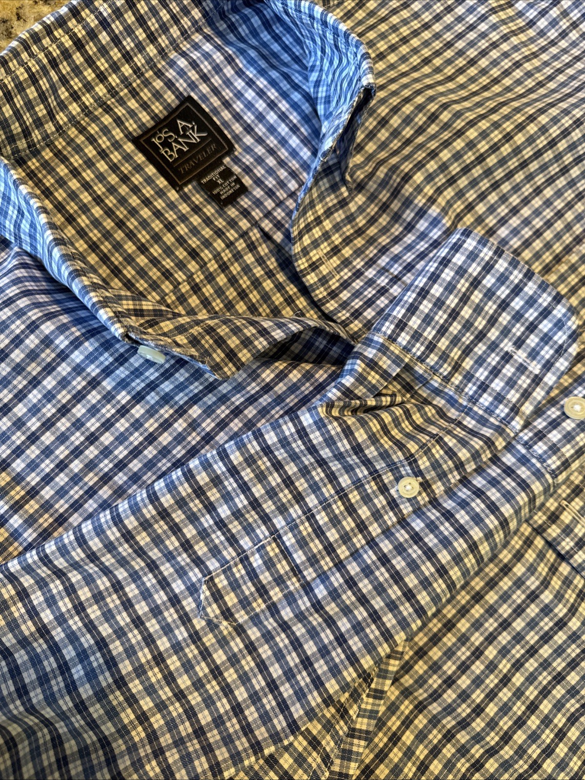 Jos A Bank Traveler Collection Dress Shirt Traditional Fit Blue/BkPlaid Men's XL