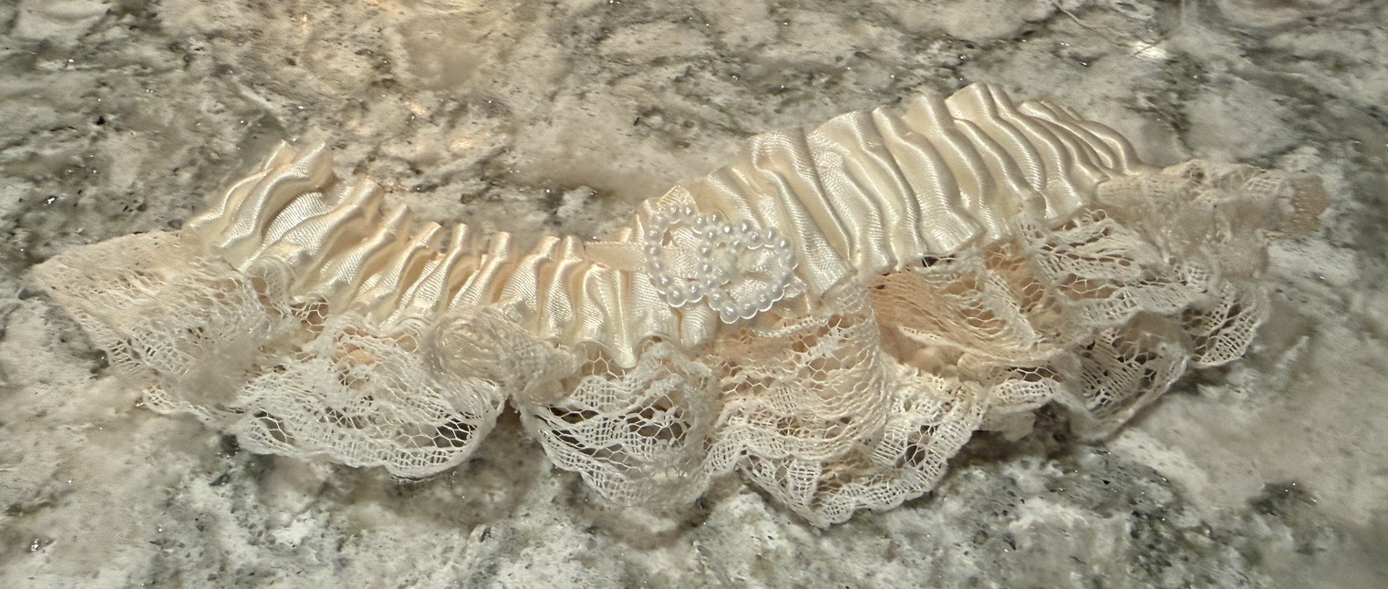Wedding Bridal Garter Ivory Satin white lace Pearl Heart Bow Stretchy S/M