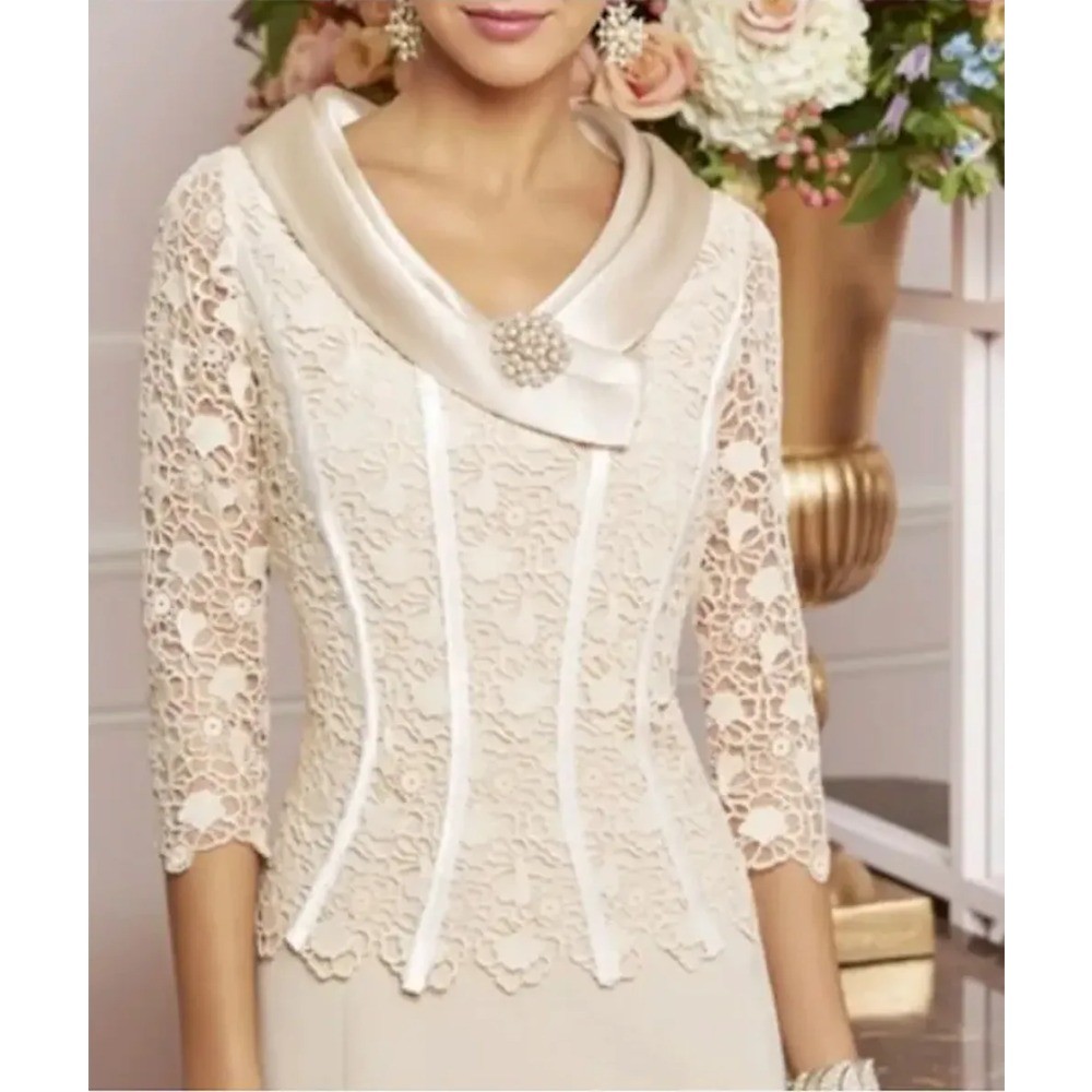 как выглядит Champagne Mother of the Bride Dress Vintage Knee Length Satin Lace Party Gowns фото