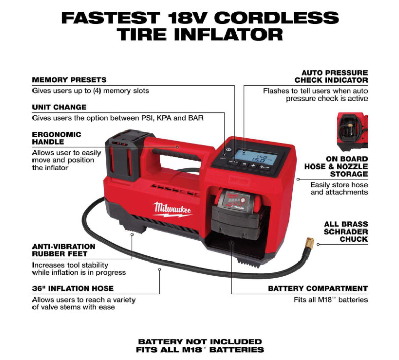 Milwaukee 2848-20 M18 18V Cordless Li-Ion Tire Inflator - Bare Tool