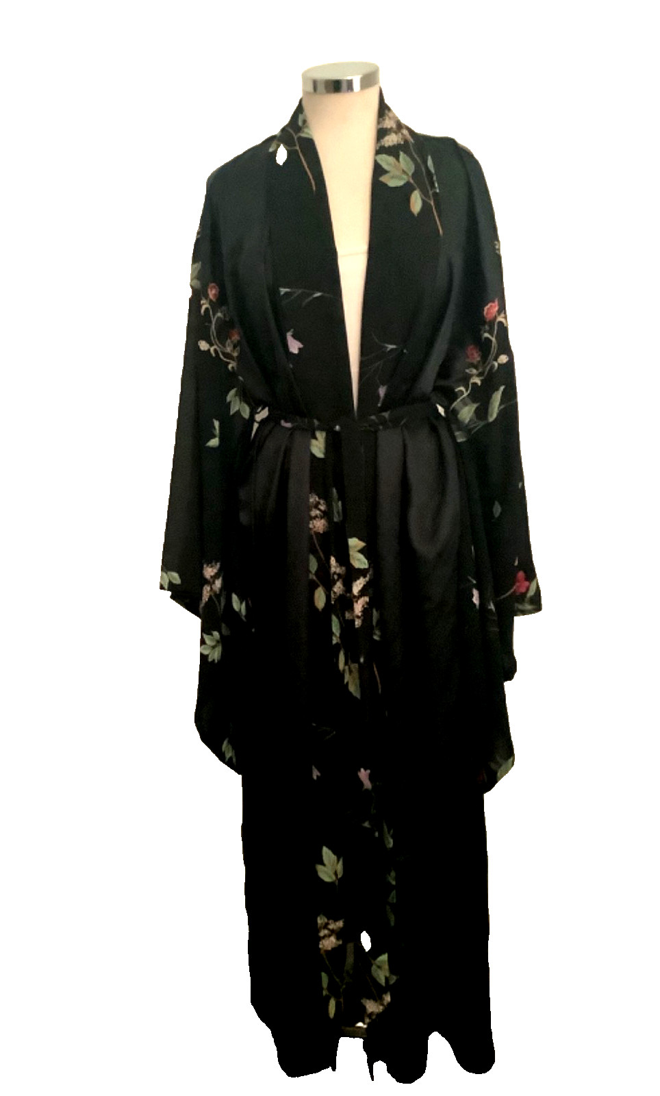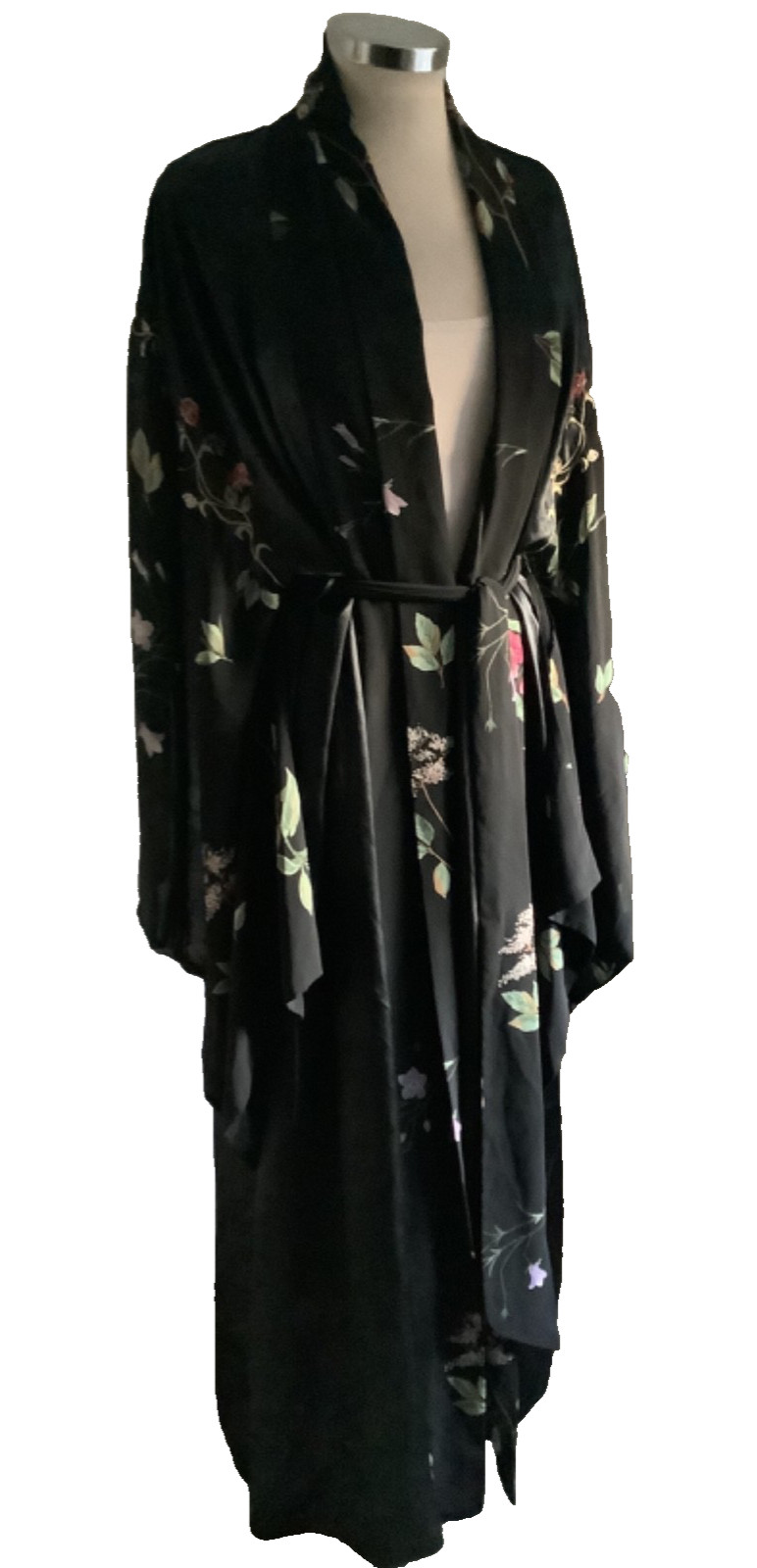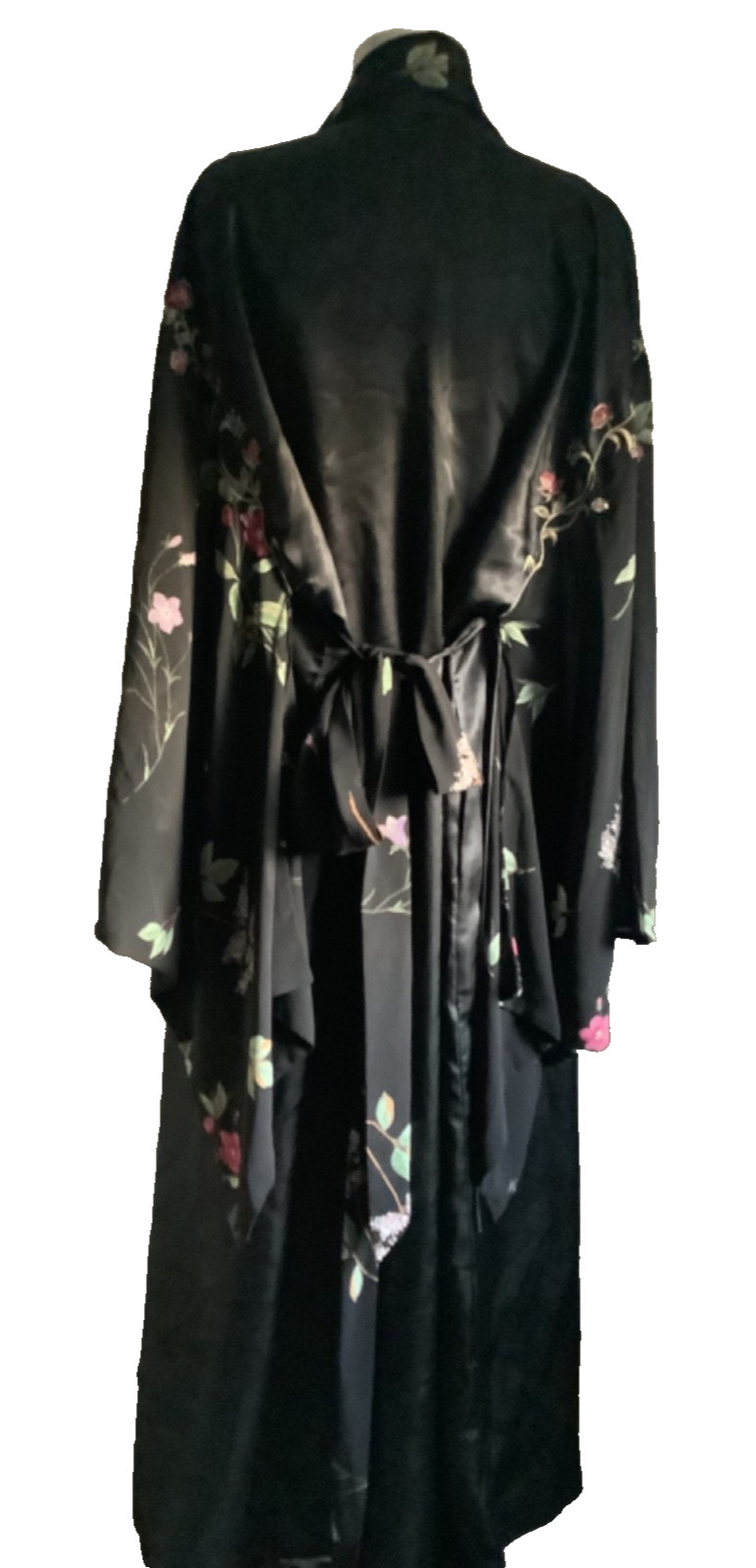 как выглядит Victoria s Secret S/M Black Satin Floral Embroidered TRUE Kimono Sleeve Robe фото