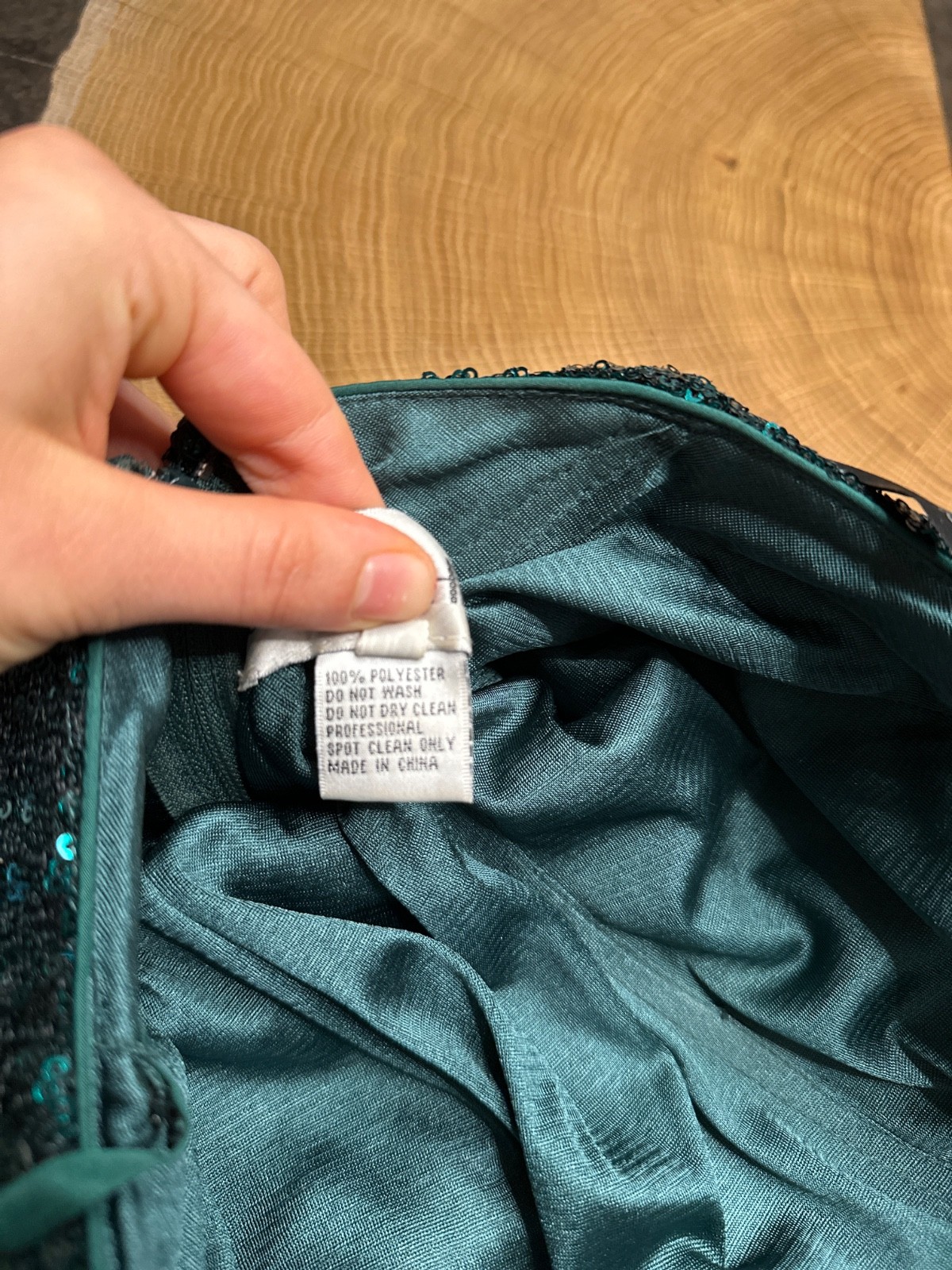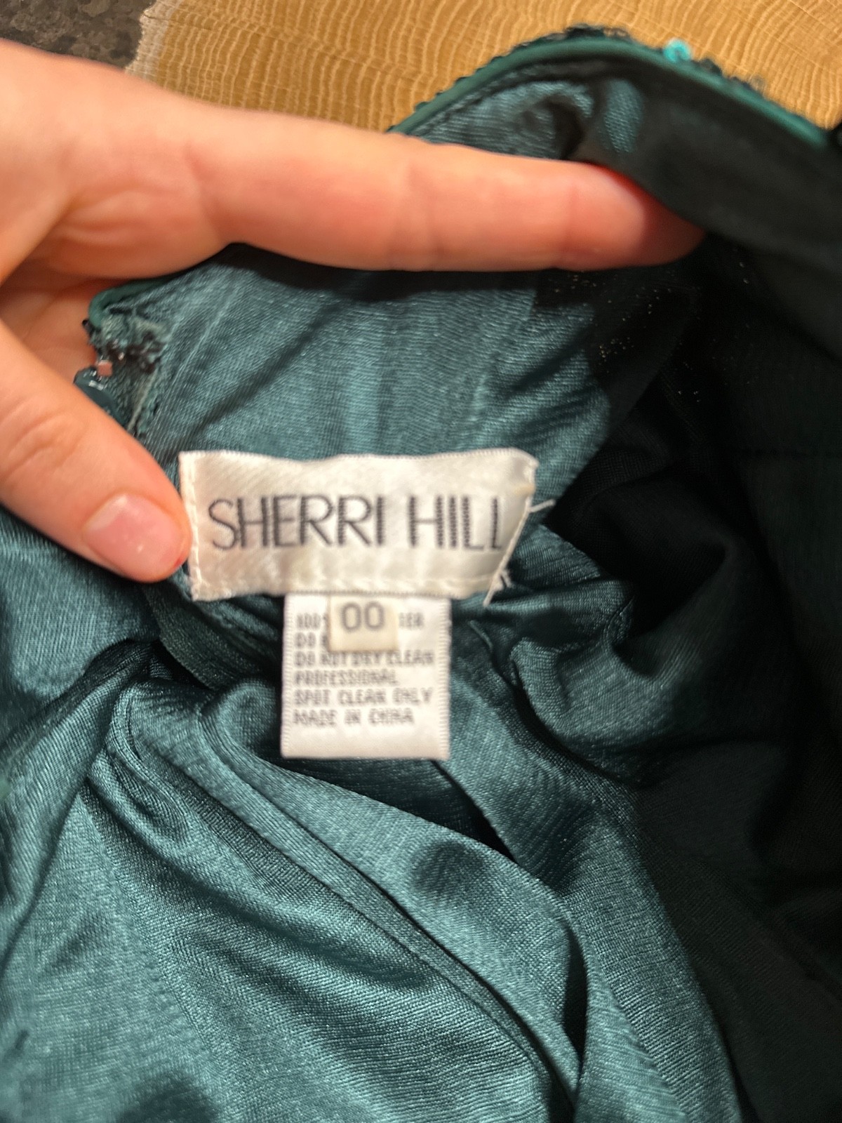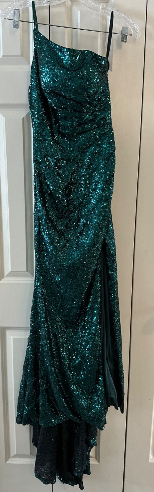 SHERRI HILL FORMAL GOWN PROM 00 GREEN SEQUINS RUCHED HIGH SLIT OFF SHOULDER