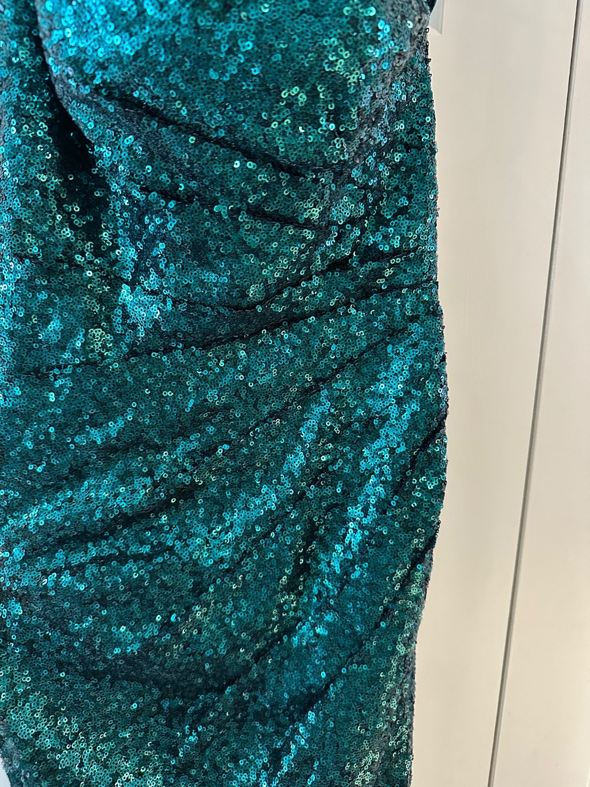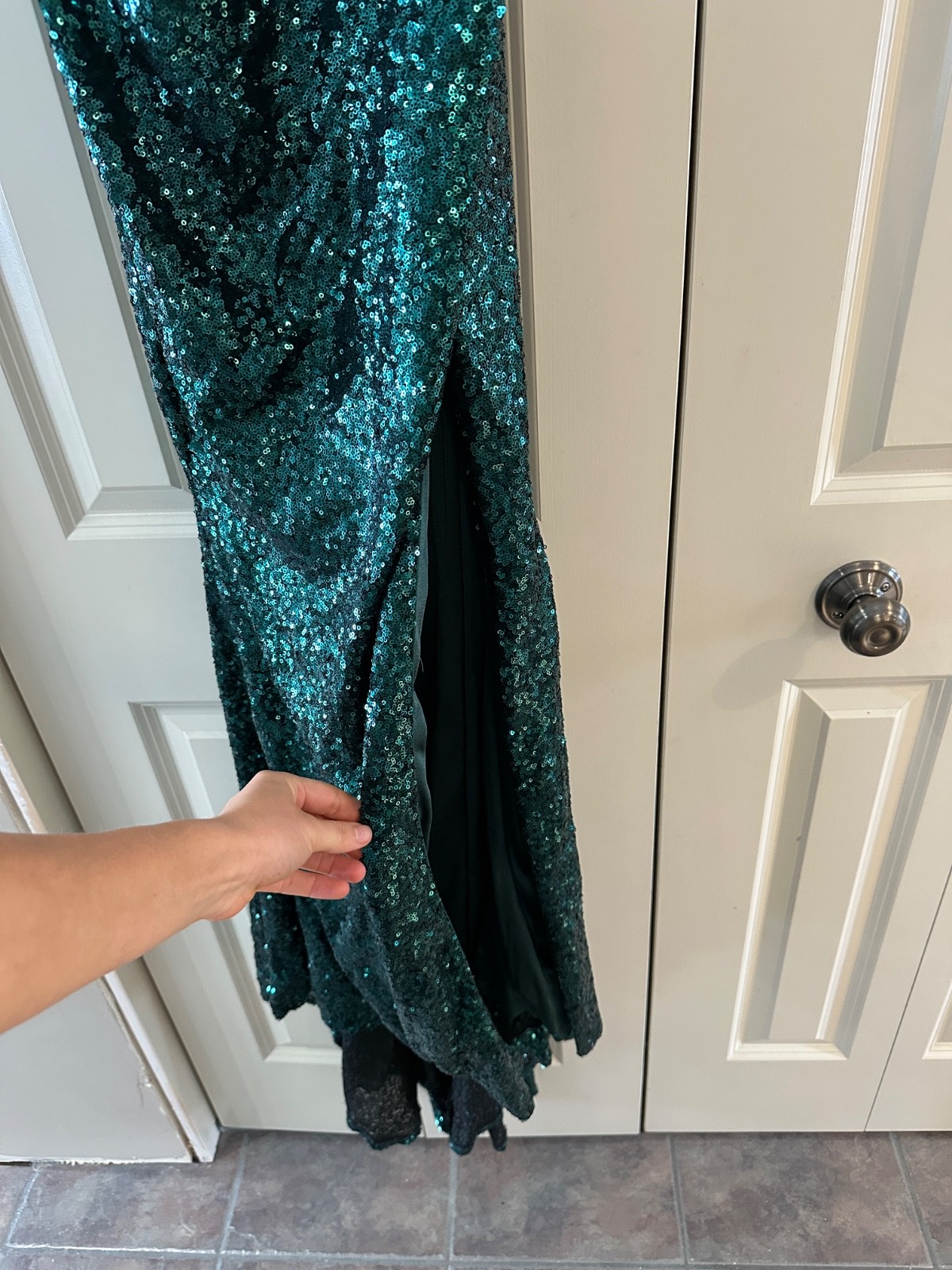 как выглядит SHERRI HILL FORMAL GOWN PROM 00 GREEN SEQUINS RUCHED HIGH SLIT OFF SHOULDER фото