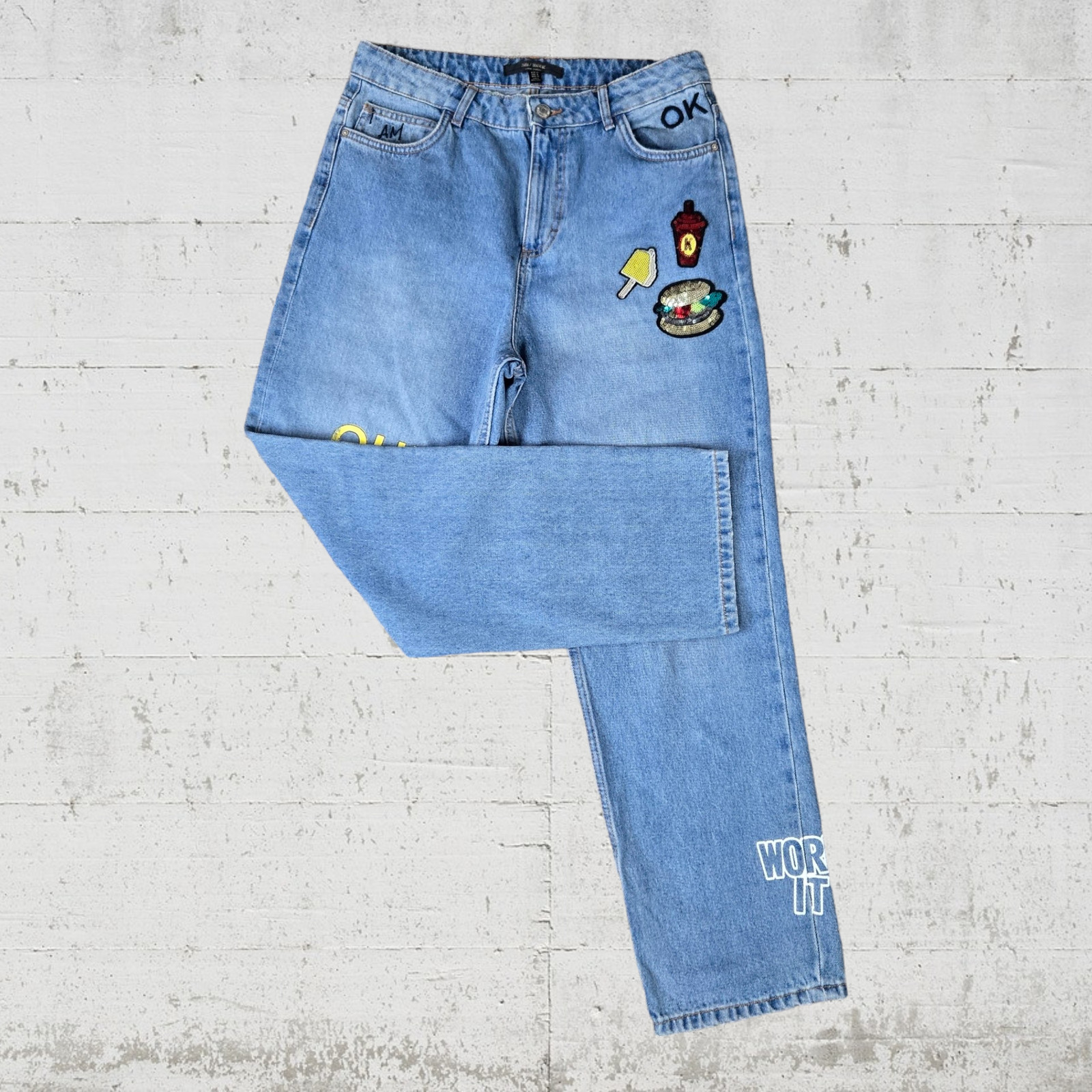 Zara Light Wash Graphic Print Embroidered Indie High Rise Straight Jeans Size 8
