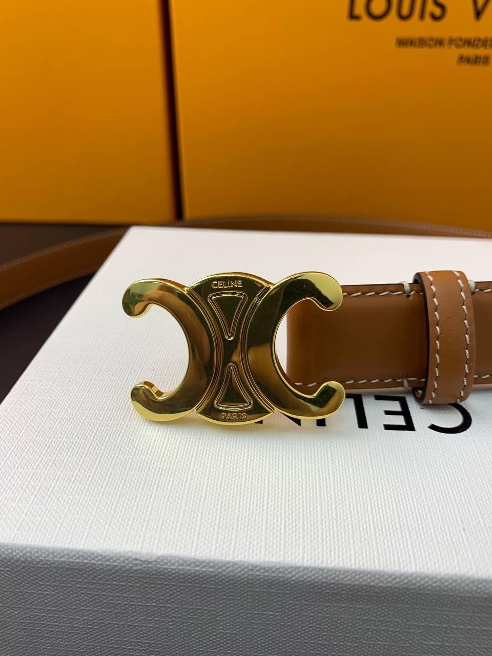 как выглядит CELINE MEDIUM TRIOMPHE BELT IN NATURAL, BROWN CALFSKIN YELLOWISH BROWN BELT 85 фото