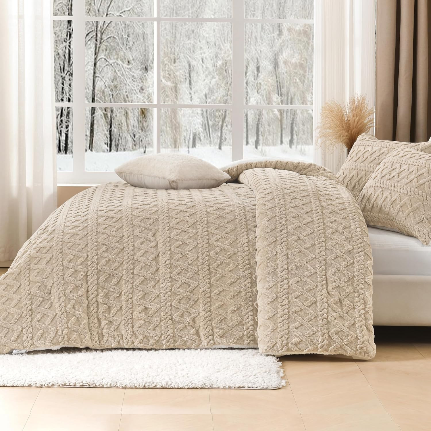 как выглядит Fluffy Sherpa King Comforter Set, Super Soft Beige Fleece Warm Bedding for Winte фото