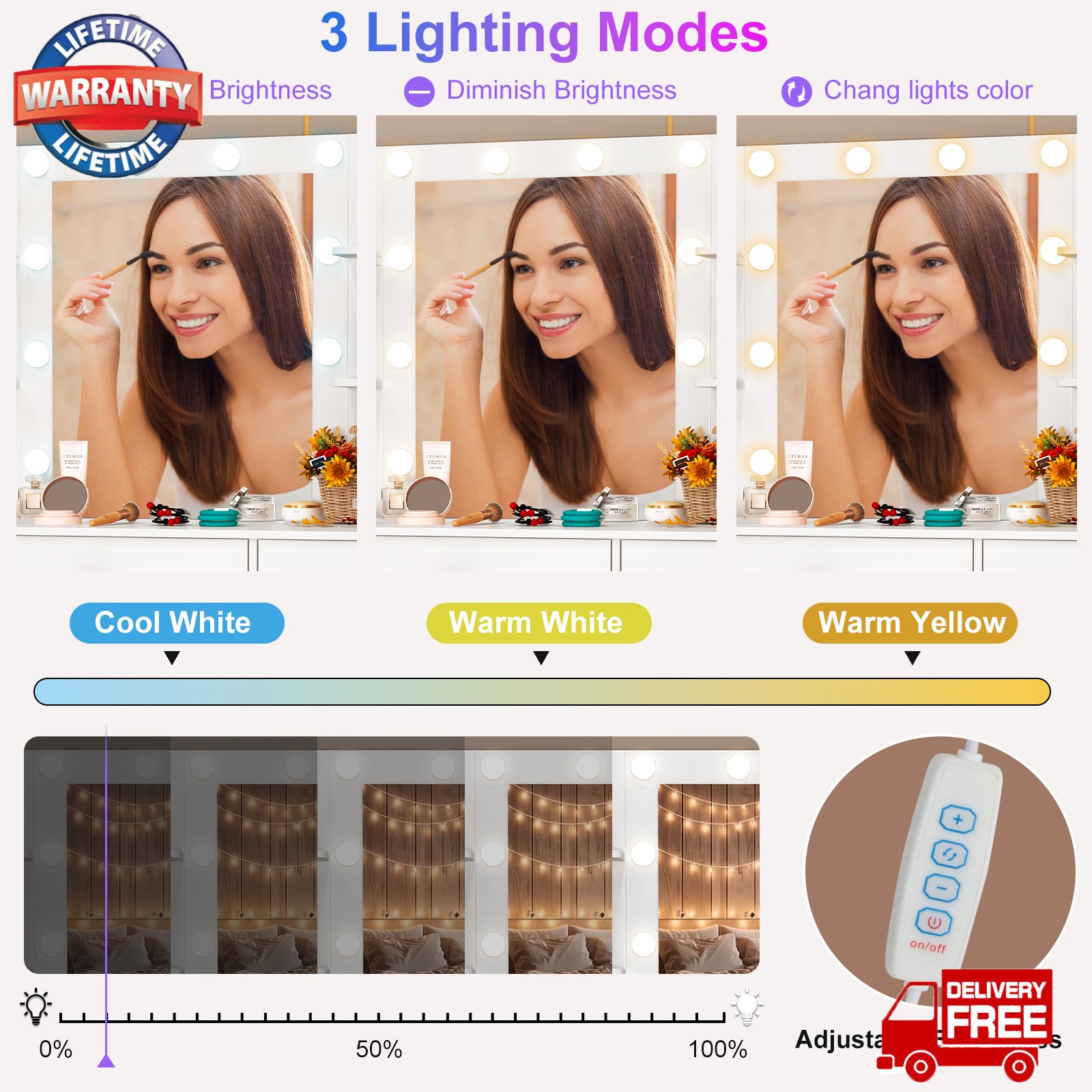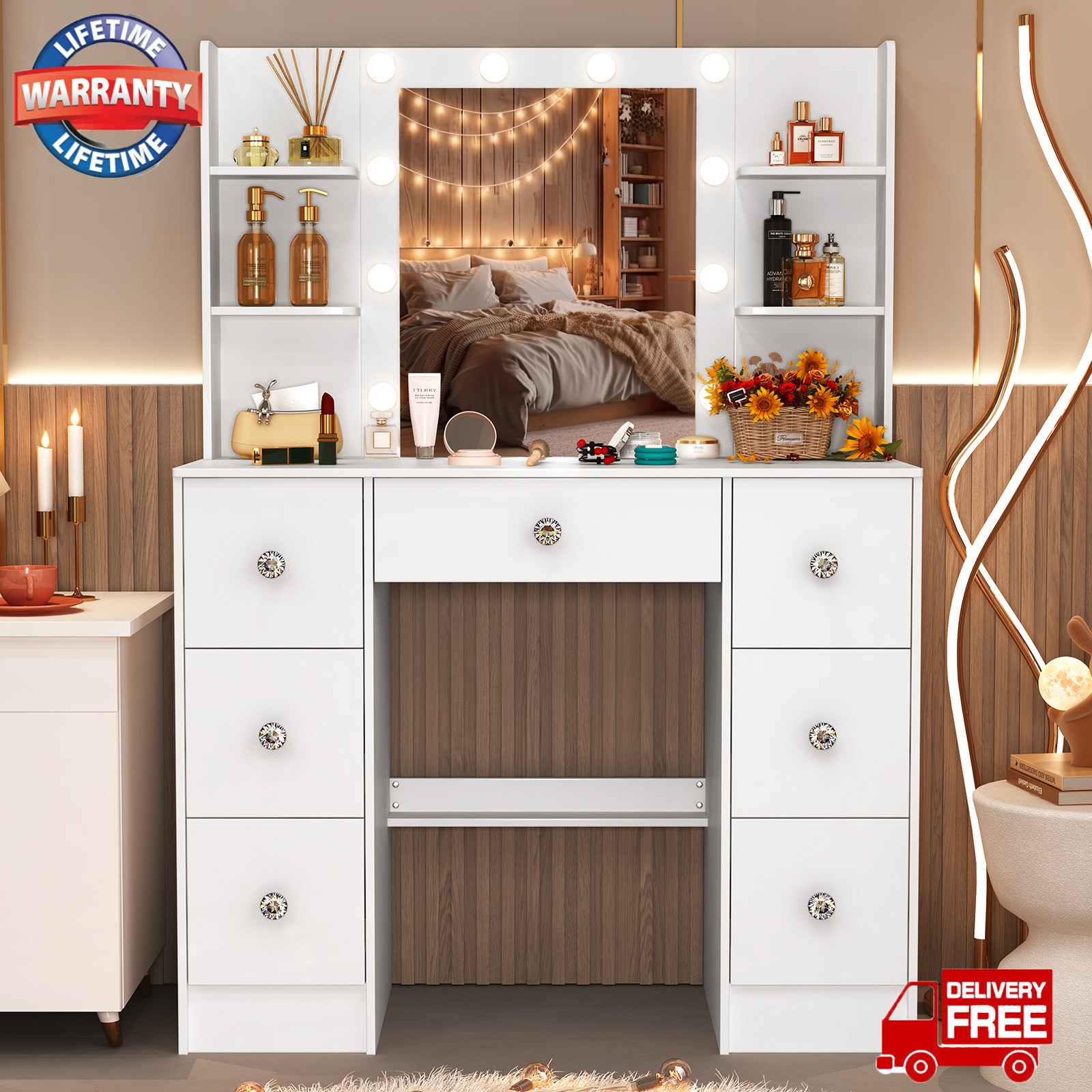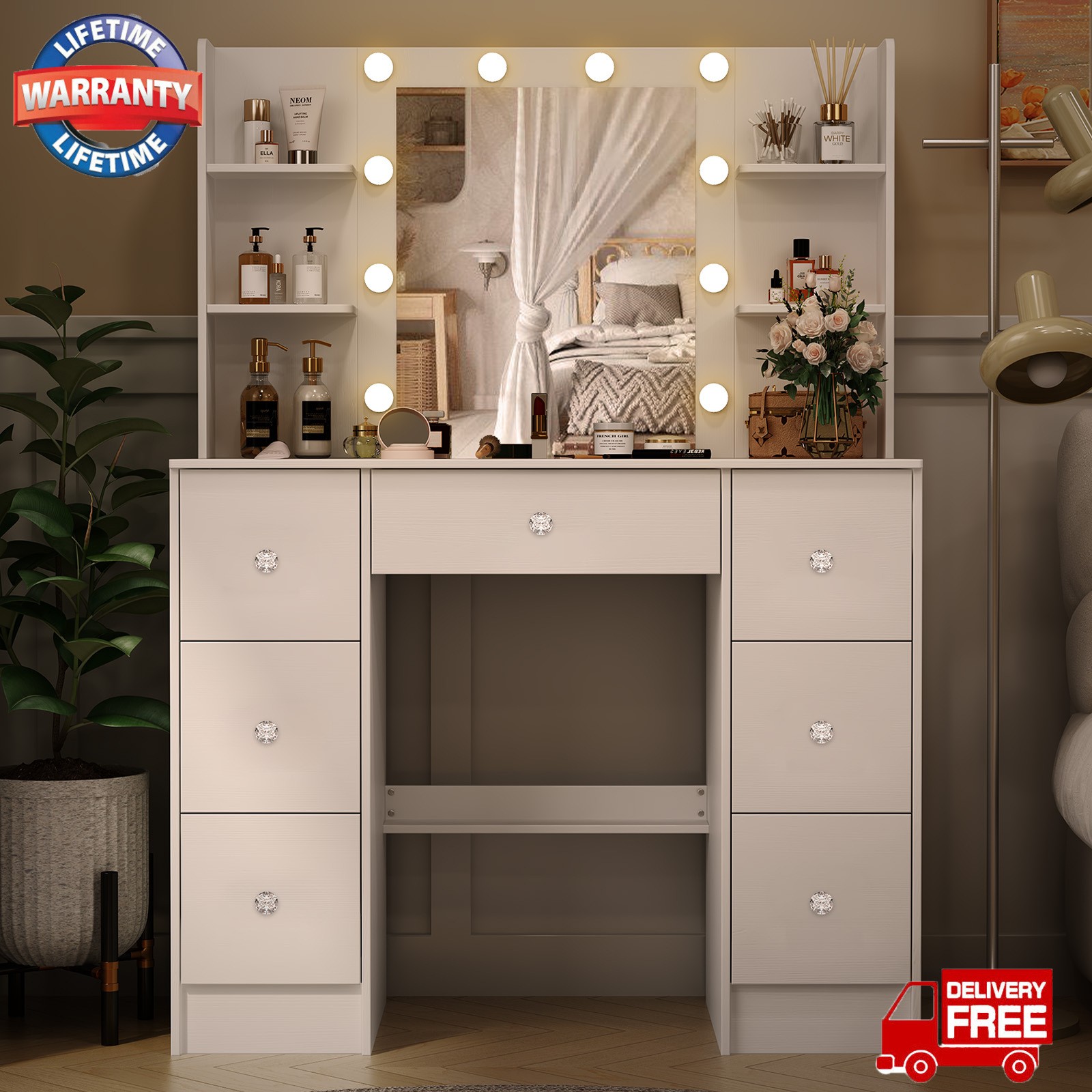 7 Drawers Vanity Desk Large Lighted Mirror Makeup Vanity Table w/ 10 Dimmer LED