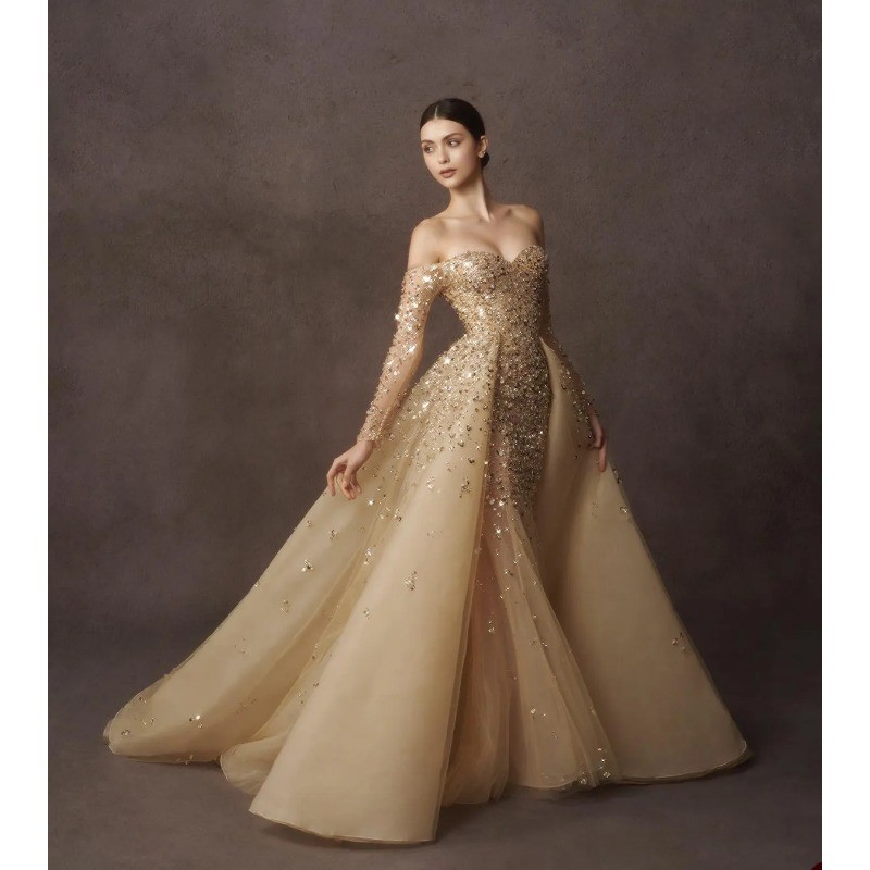 как выглядит Gold Ball Wedding Dresses V Neck Sequins Appliques Beaded Ruffles 3D Lace Gowns фото