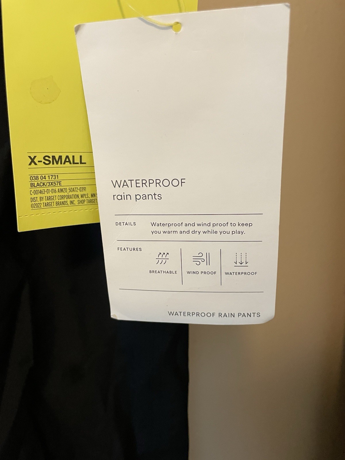 All in Motion Unisex Pull On Waterproof Rain Pants, NEW, Black, Size XS