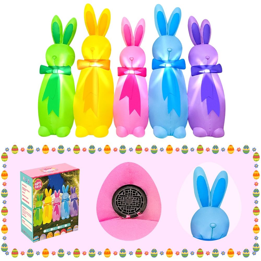 6FT Easter Inflatables Outdoor Decoration Five Colorful Bunny, Built in Light...