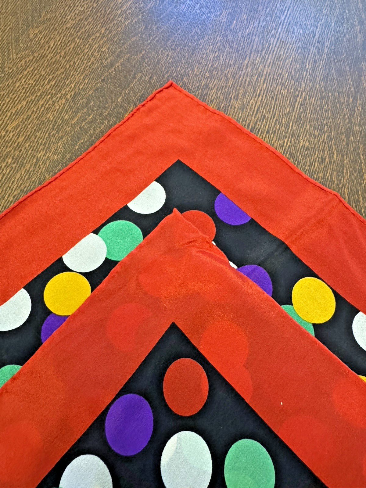 как выглядит VTG ECHO 10 100 Silk Scarf, Red Brdr, black background, multi-colored polkadots фото