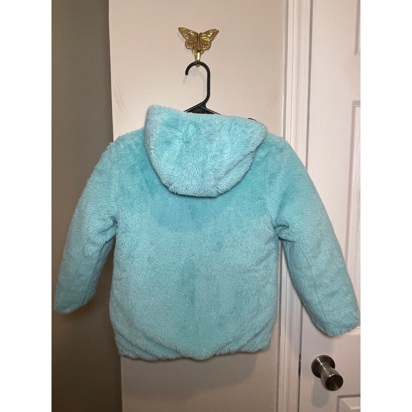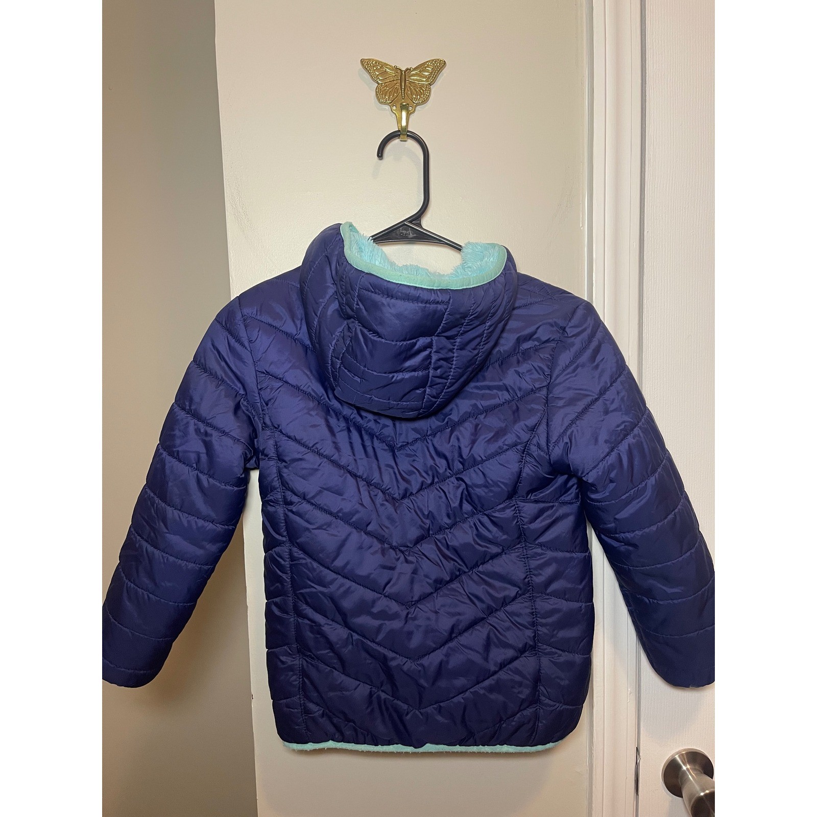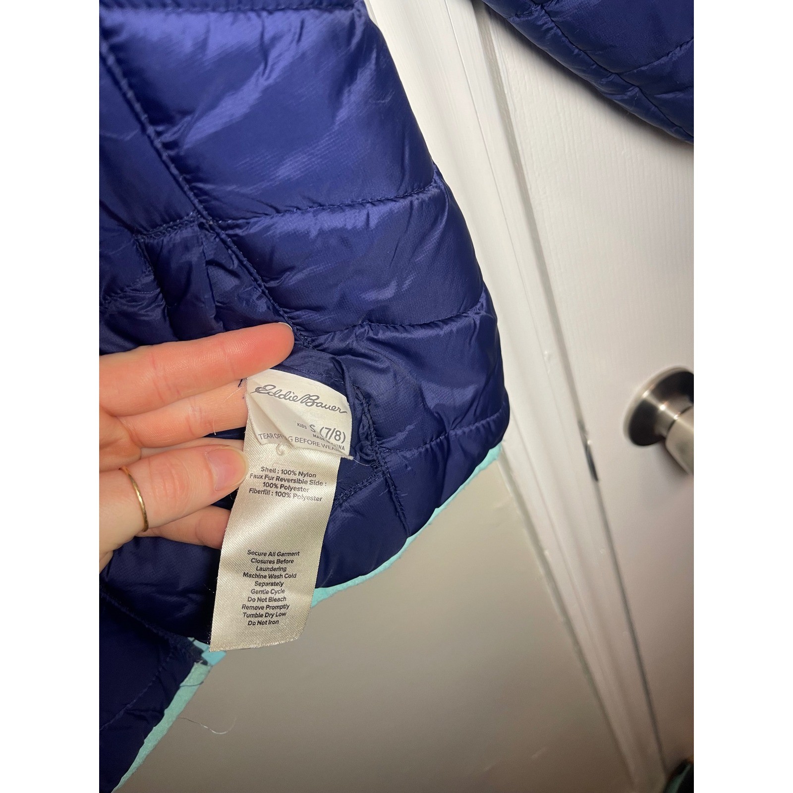 как выглядит Eddie Bauer Kids Reversible Puffer Fleece Jacket Navy Blue Teal Size S 7 8 фото