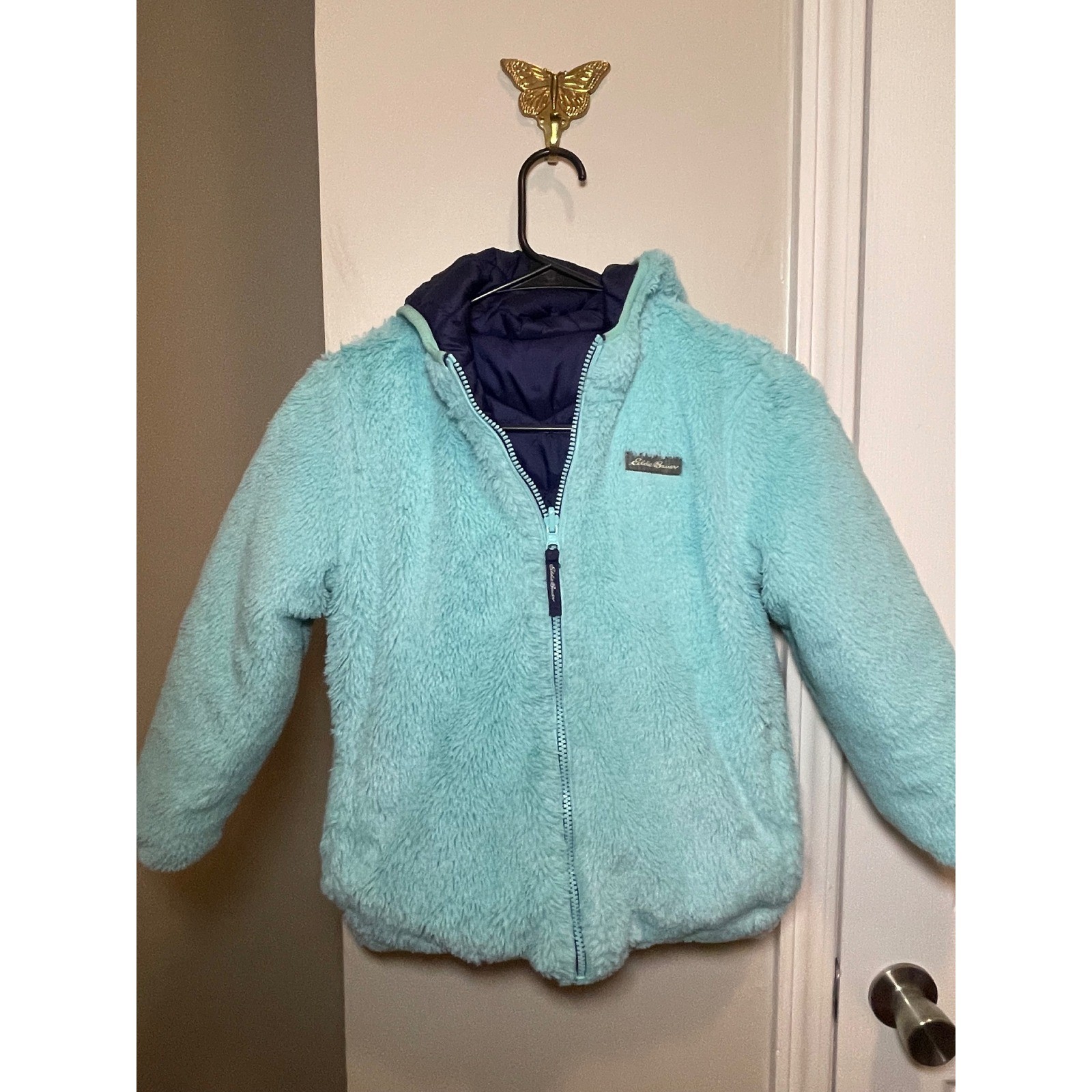 Eddie Bauer Kids Reversible Puffer Fleece Jacket Navy Blue Teal Size S 7 8