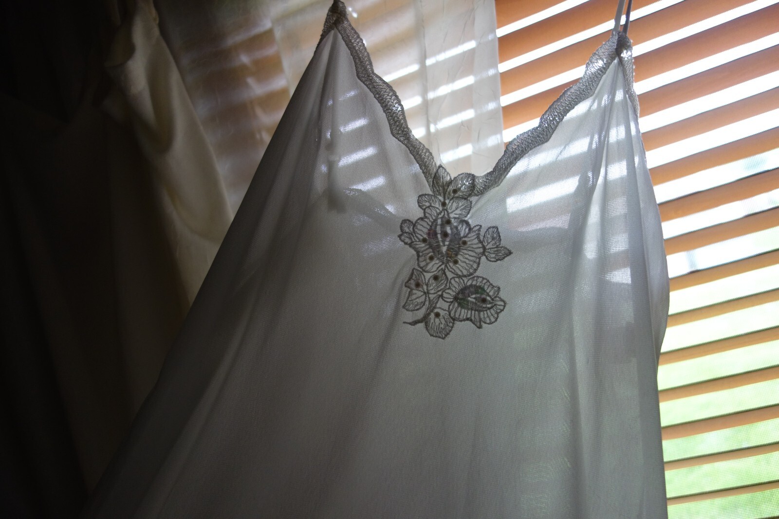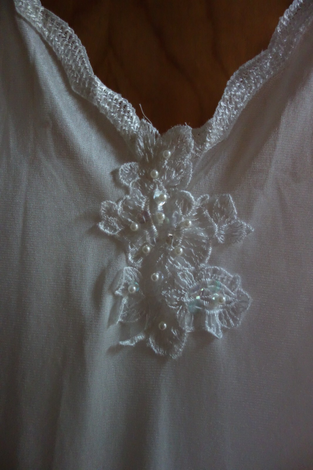 как выглядит Vintage Long Nightgown White Nylon Embellished Neckline Size Medium Slip Style фото