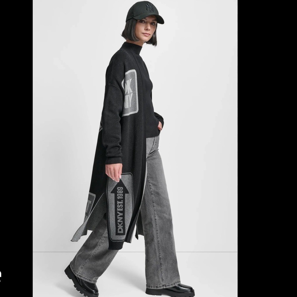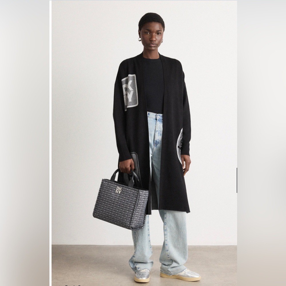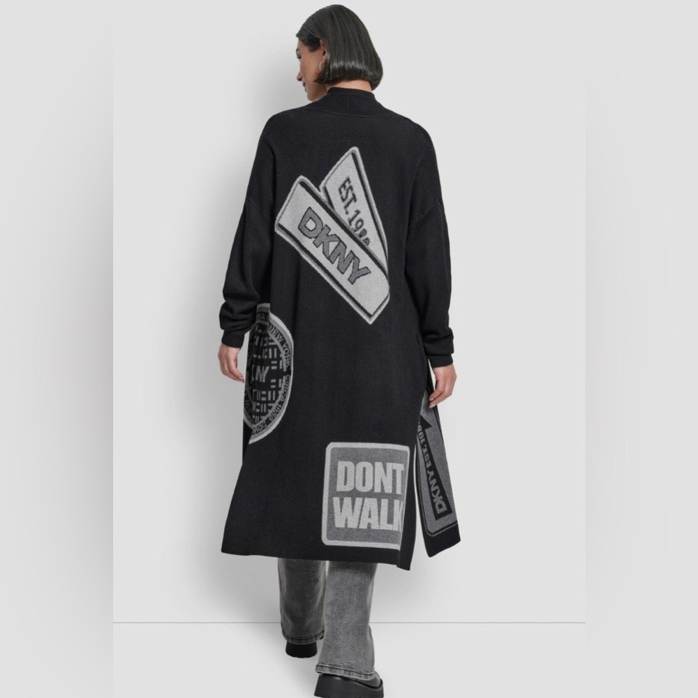 как выглядит DKNY Black gray Donna Dont Walk patch monogram oversized Cardigan size XS new фото
