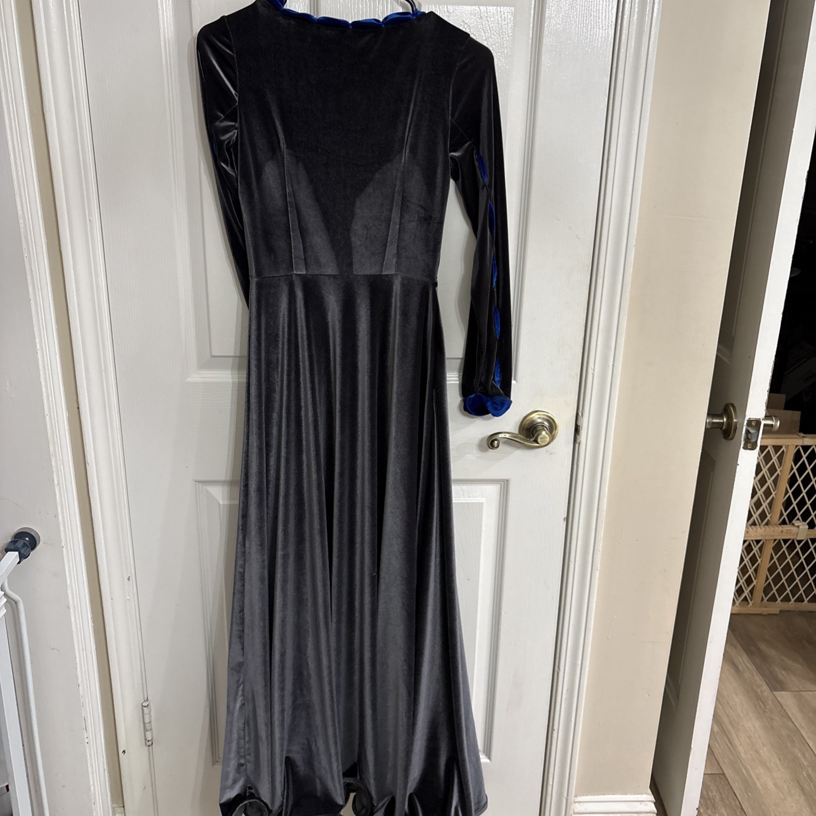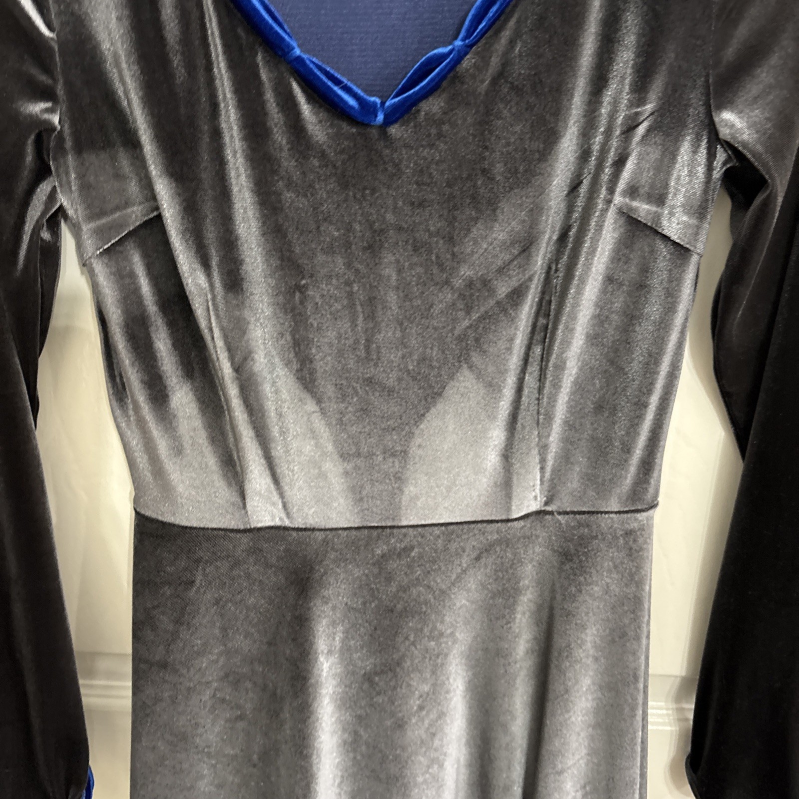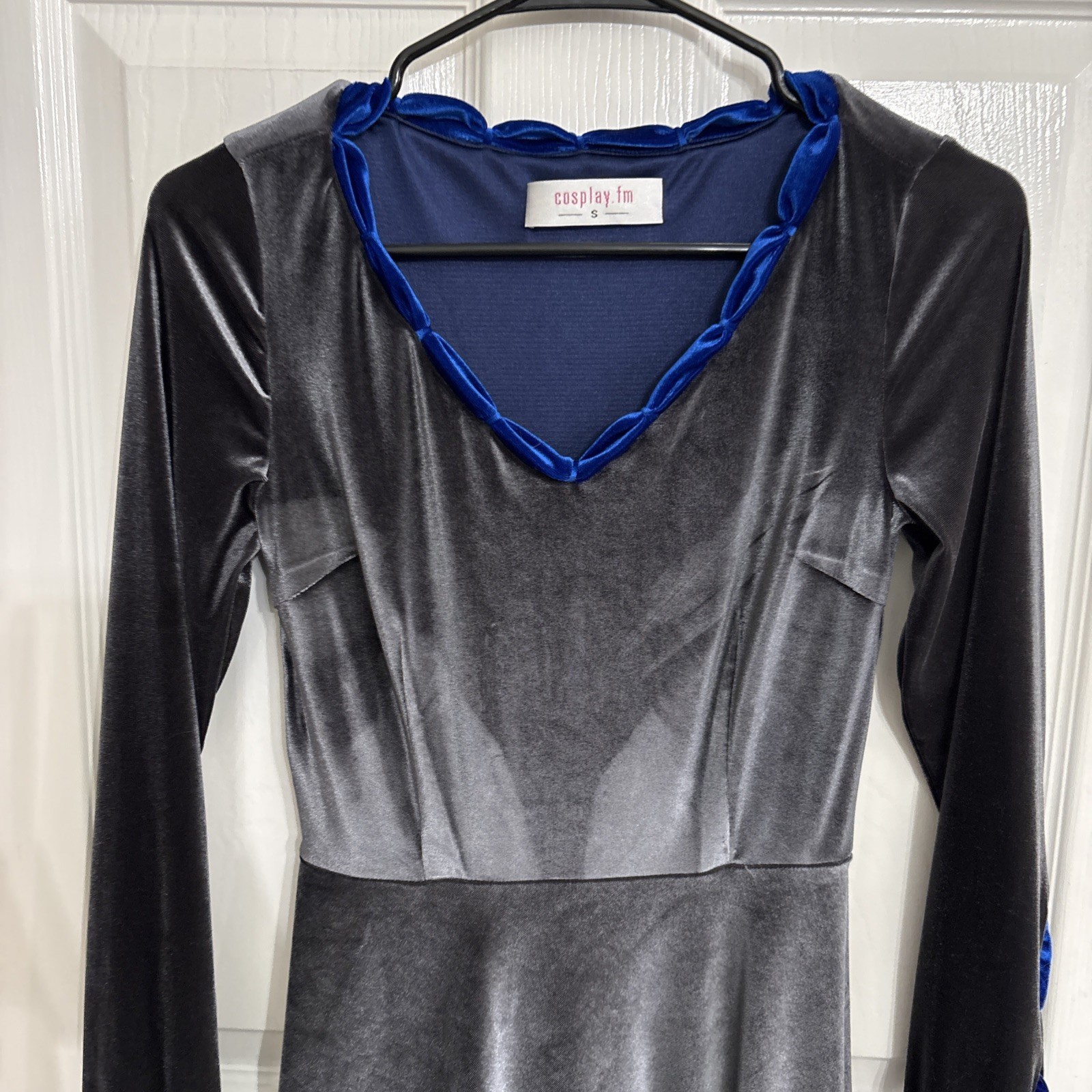 как выглядит Cosplay Gray Velvet Dress V-neck Blue Trim Maxi Medieval Gown Renaissance Heavy фото