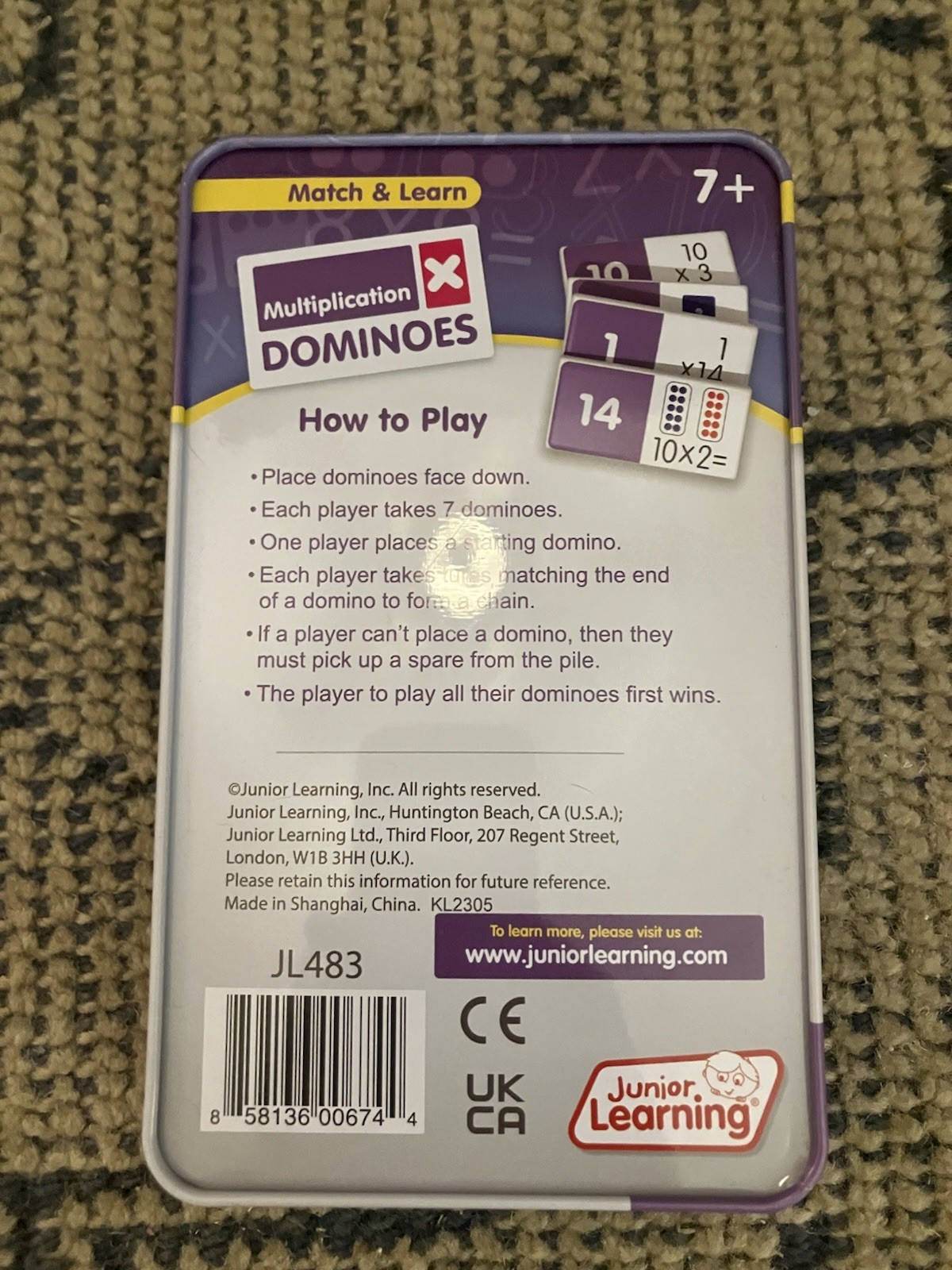 Junior Learning Multiplication Dominoes Math Game 28 Pieces Ages 7 Homeschool