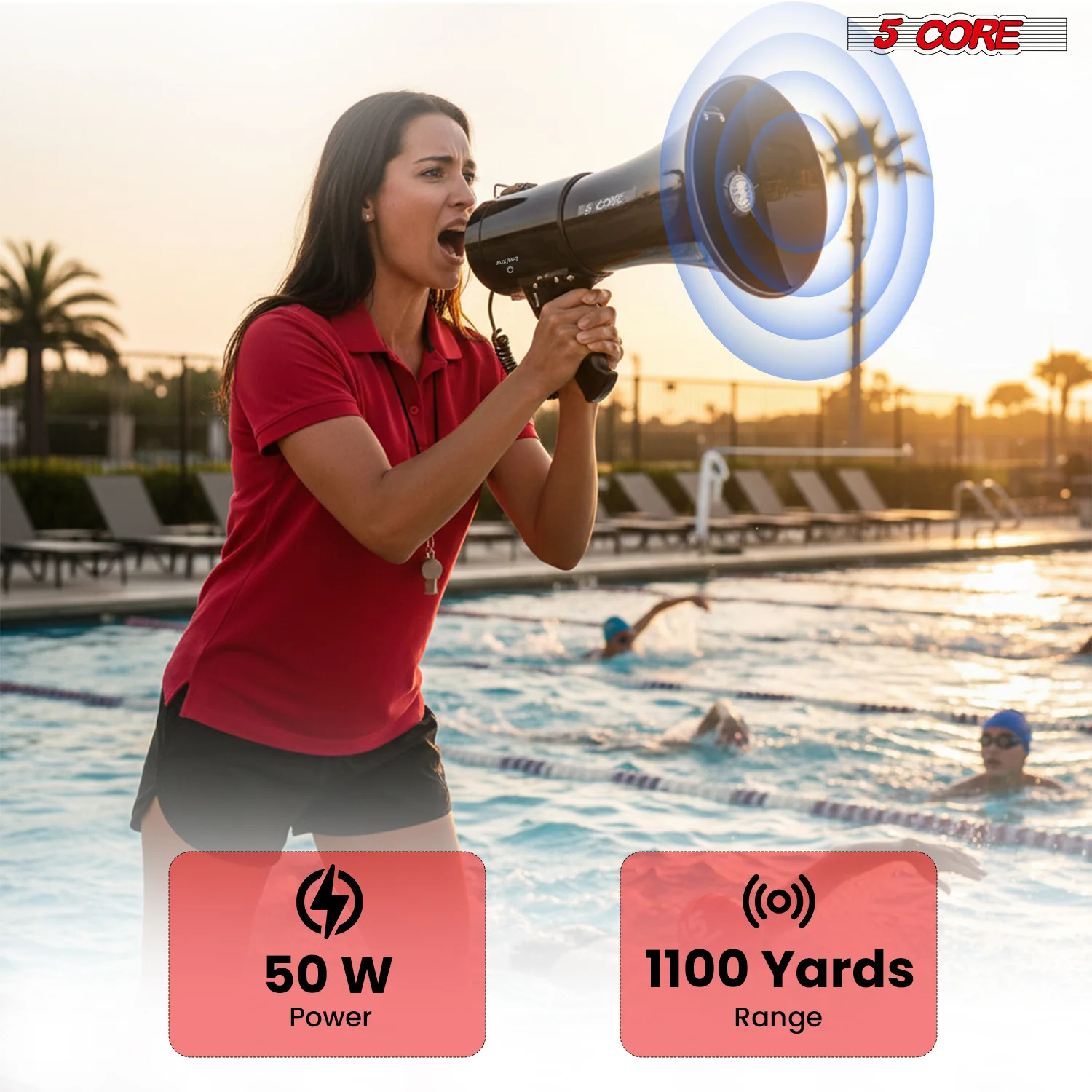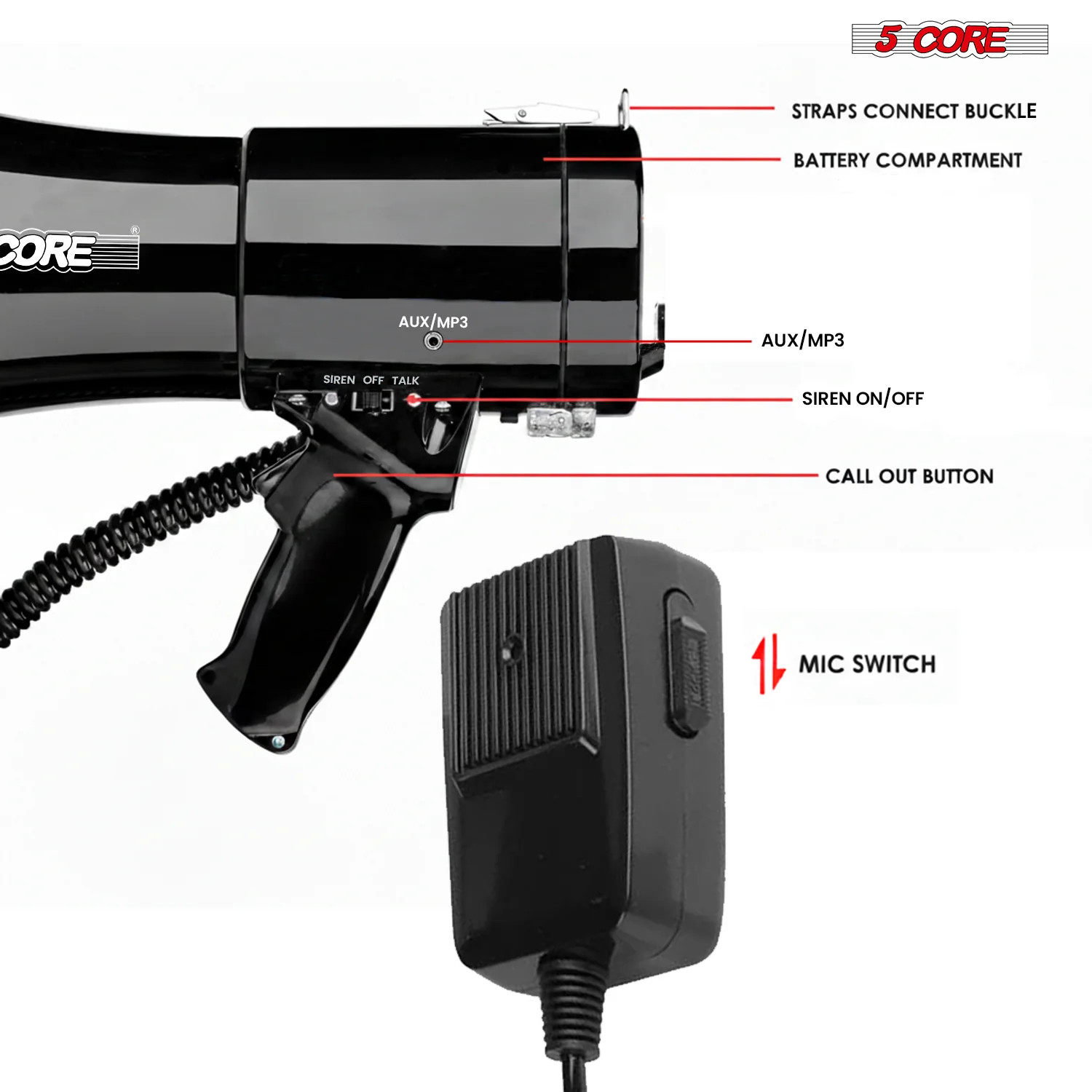 5 Core Megaphone Bullhorn 50W Speaker w Handheld Mic Shoulder Strap Loud Audio