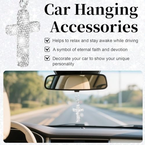 Cross for Car Mirror Hanging, Bling Cars Pendant Charm, Double-Sided White