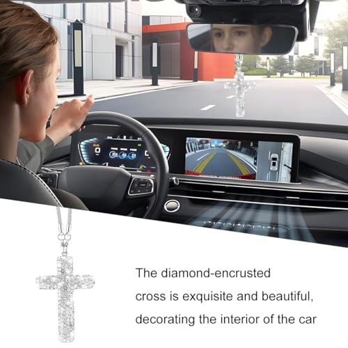 Bling Cross Car Rear View Mirror Charm, Crystal Rhinestone Religious White