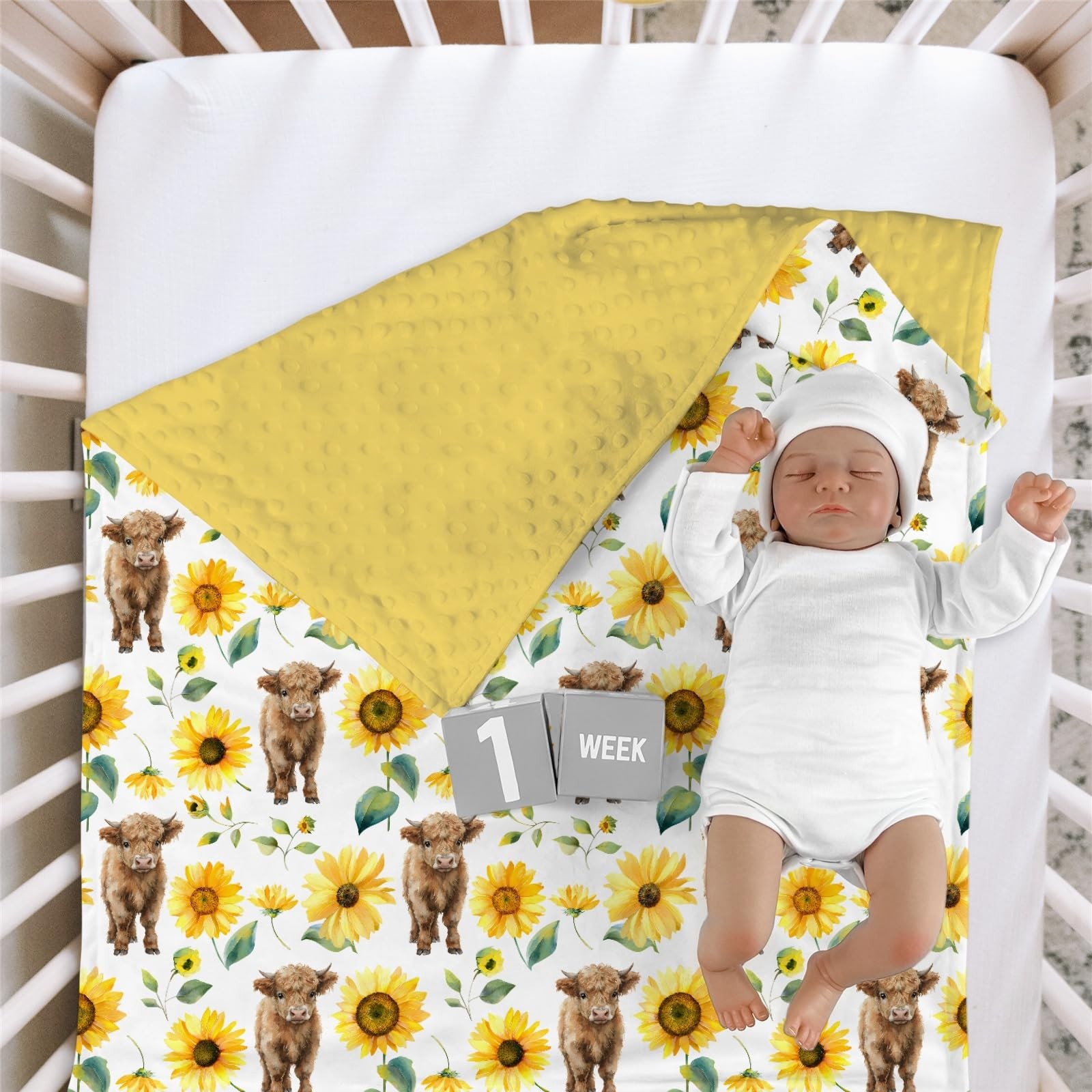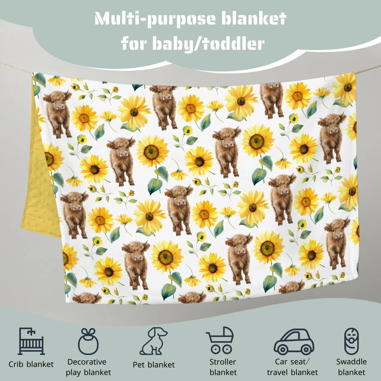 Highland Cow Sunflower Mink Baby Blankets Dotted Backing Girls Shower Gift, W...